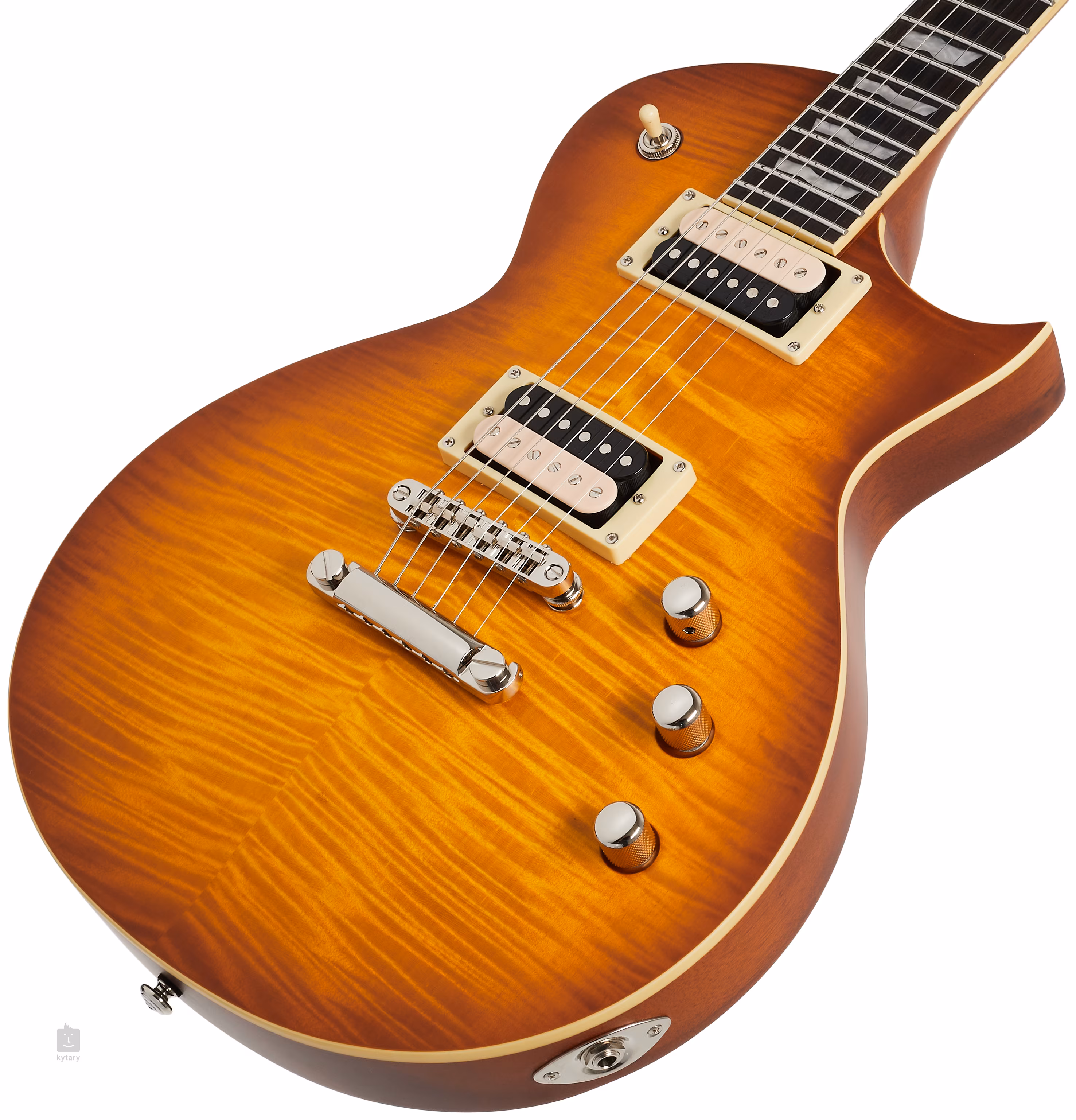 Mahoniowy korpus modelu EC-1000TFM HBS F zdobi efektowna okleina z klonu falistego. Jest to gitara z masywnym korpusem o standardowej grubości tradycyjnych modeli LP, w porównaniu z którymi jest jednak lżejsza dzięki komorowaniu korpusu, co docenisz po dłuższym graniu zarówno Ty, jak i Twój kręgosłup. Do gryfu złożonego z trzech kawałków mahoniu o konstrukcji set-thru, tj. z gryfem osadzonym głębiej w korpusie, oraz węższym, szybkim profilem Thin U przyklejona jest podstrunnica z hebanu makassar, wyposażona w dwadzieścia dwa progi w rozmiarze Extra Jumbo. Orientację na podstrunnicy ułatwiają blokady pozycyjne.