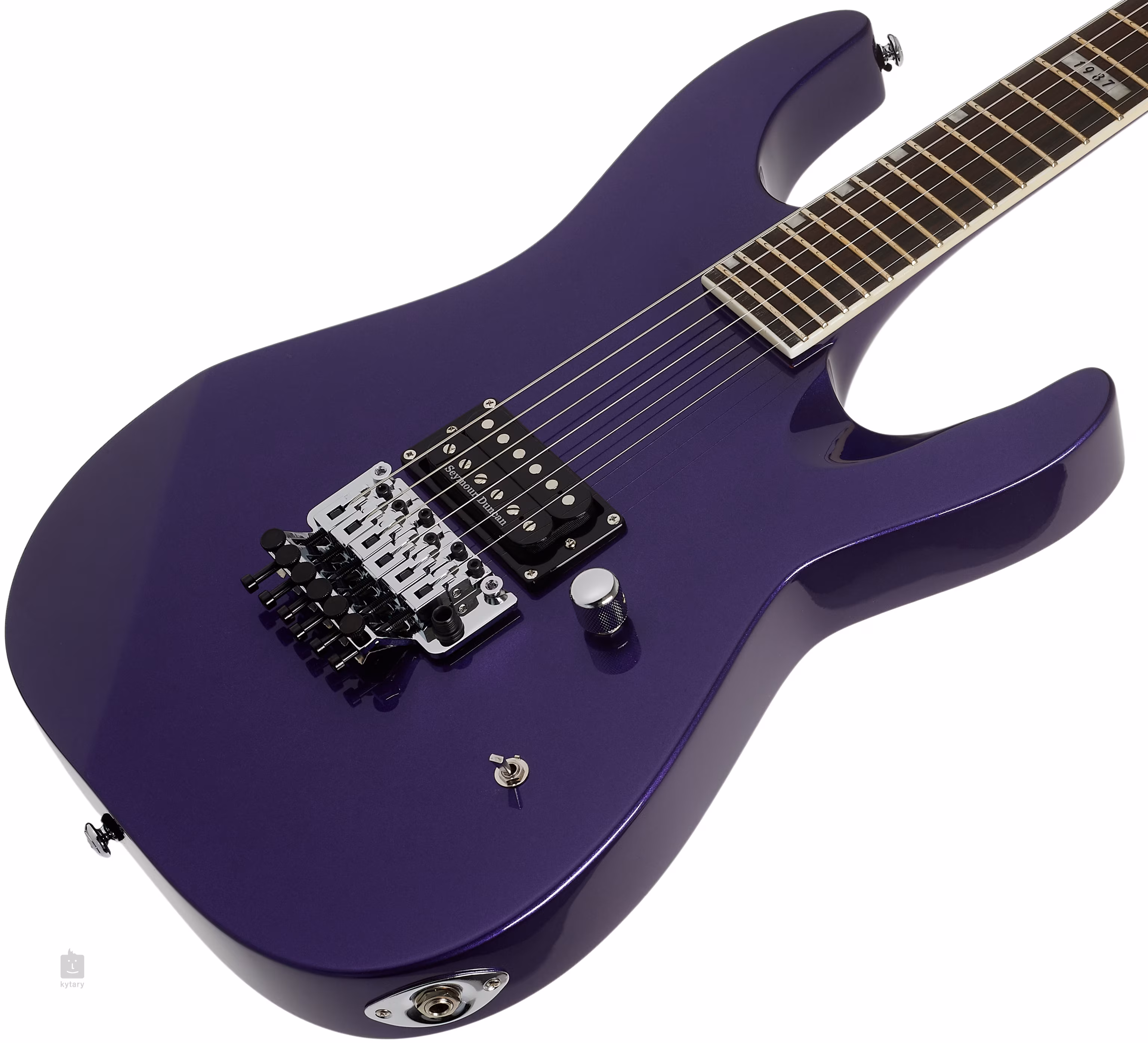 M-1 CTM '87 DARK METALLIC PURPLE to instrument o konstrukcji korpusu składającej się z olchowych skrzydeł i trzyczęściowej klonowej szyjki. Dwadzieścia cztery progi Extra Jumbo dzielą hebanową powierzchnię podstrunnicy Macassar. Orientację na jego powierzchni ułatwiają przesunięte bloki pozycyjne.