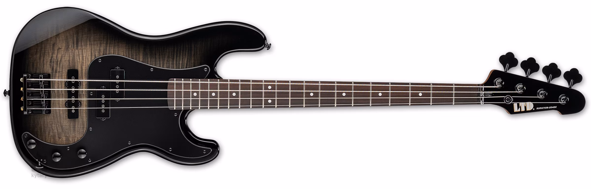 Elektryczna gitara basowa Surveyor-204DX Black Burst udostępnia klasyczny design ESP PB również basistom i basistkom, dla których modele z logo ESP są obecnie niedostępne cenowo. Korpus gitary basowej z topoli zdobi fornir z korzenia topoli (poplar burl). Do wygodnego, przykręcanego gryfu z pieczonego klonu (roasted maple) przyklejono palisandrowy podstrunnicę z dwudziestoma progami w rozmiarze Extra Jumbo.