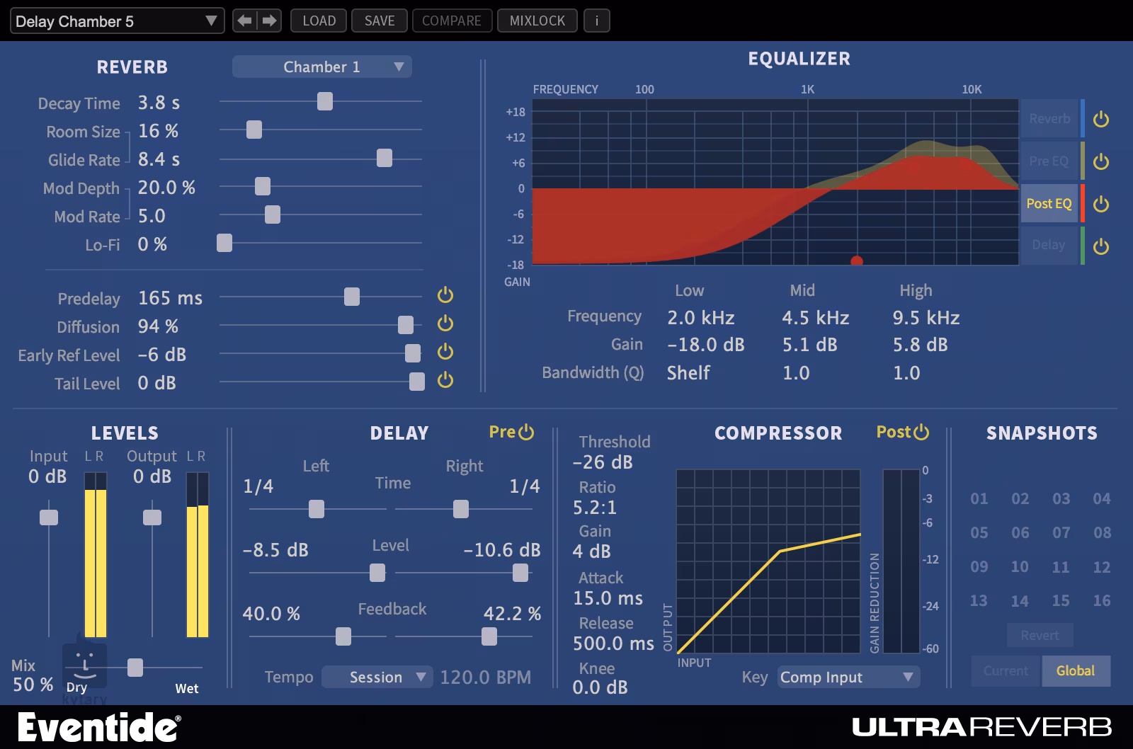 Dostępne są algorytmy takie jak Plate, Hall, Chamber, Room i Ambience, przy czym każdy typ oferuje dwie odmiany, które wychwytują niuanse określonych charakterystyk akustycznych. Szczegółowa kontrola parametrów takich jak PreDelay, Decay, Room Size, Diffusion i cztery niezależne 3-pasmowe korektory (dla pre/reverb, post-delay, reverb EQ i delay EQ) dają użytkownikowi pełną kontrolę nad całą strukturą efektu.
