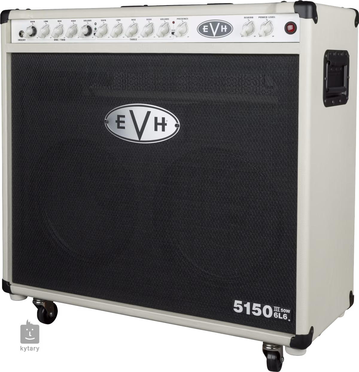 EVH 5150III 2x12 50W 6L6 Combo Ivory to trzykanałowe lampowe combo gitarowe o mocy 50W. Trzy kanały oferują wszystko, od krystalicznie czystych brzmień, przez rockowe przesterowanie, aż po zniekształcenia o wysokim wzmocnieniu, które można uzyskać na drugim kanale - to po prostu 5150. Żądane brzmienie ustawia się za pomocą podwójnych regulatorów głośności i wzmocnienia oraz współdzielonego trójpasmowego korektora dwóch pierwszych kanałów, oddzielnych regulatorów dla trzeciego kanału (Gain, Volume, Bass, Mid, High) oraz regulatorów Presence i Resonance na końcowym stopniu. Dostępny jest również wbudowany efekt pogłosu.