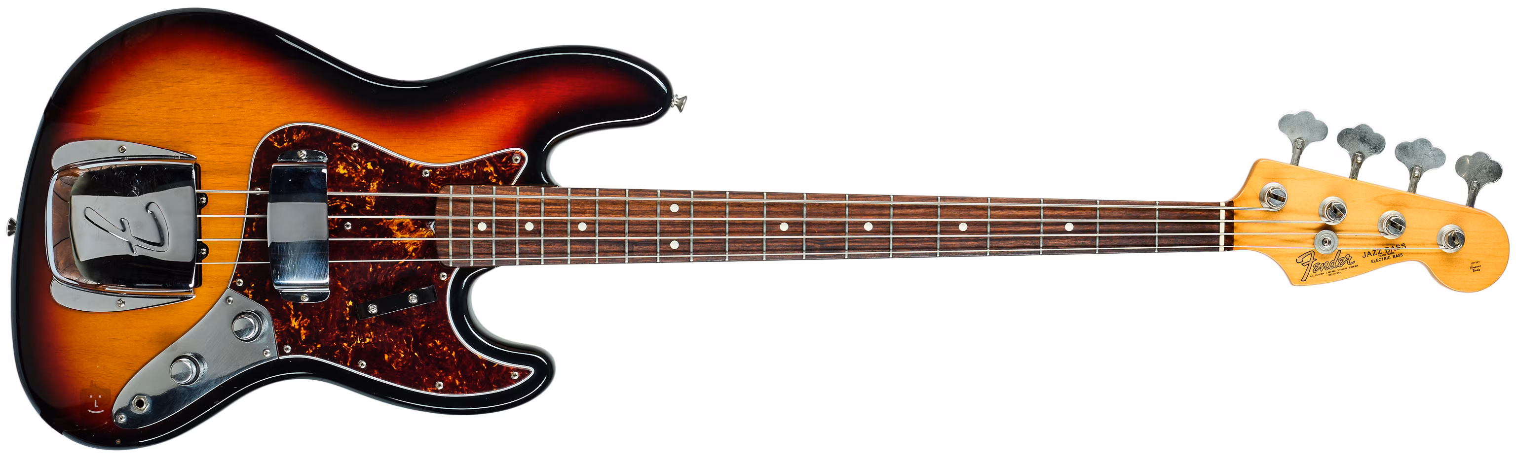 Tak zwany 2-Knob Jazz Bass z elektroniką z lat 1960-62, gdzie każdy przetwornik ma własną osłonę tonu. Cień pickguarda jest typowo poprowadzony przez olchowy korpus.