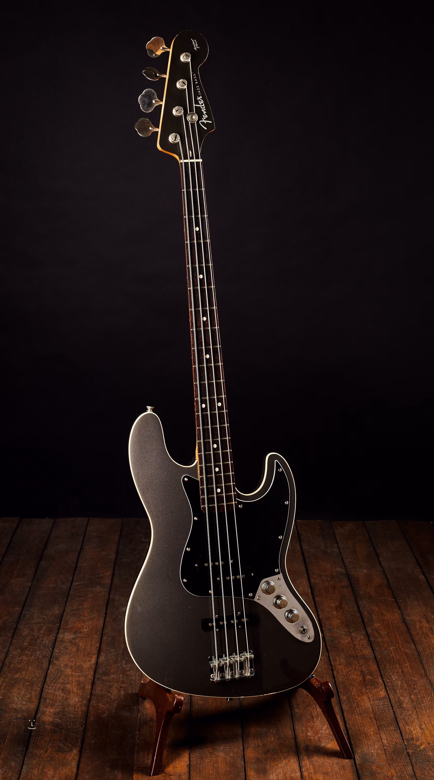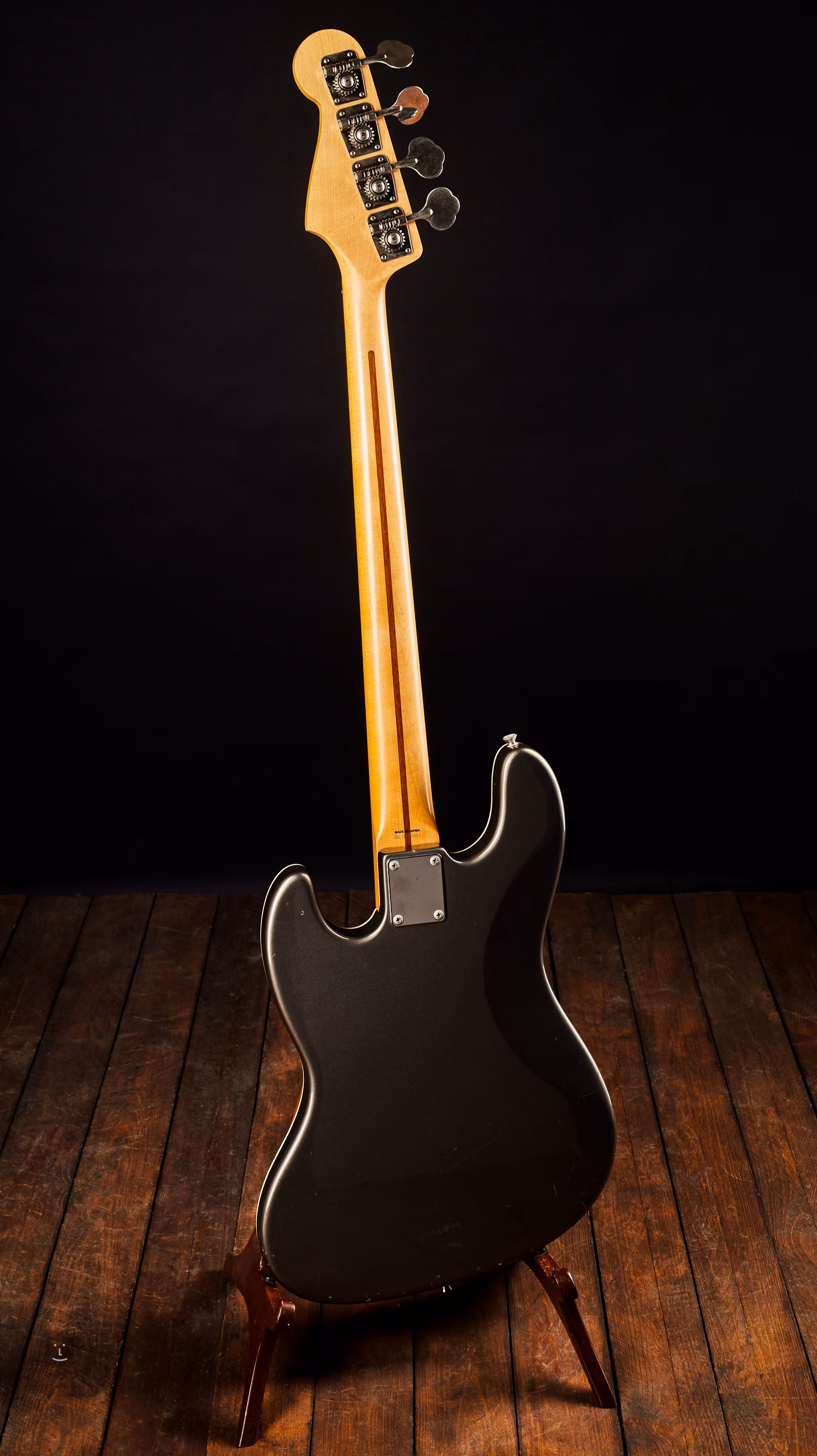 Japoński Fender Jazz Bass z serii Aerodyne ze specjalnie ukształtowanym eleganckim korpusem w rzadkim szarym metalicznym kolorze, w tym lakierowaną "dopasowaną główką". Fabryczne przetworniki Fender w pasywnej konfiguracji P/J.