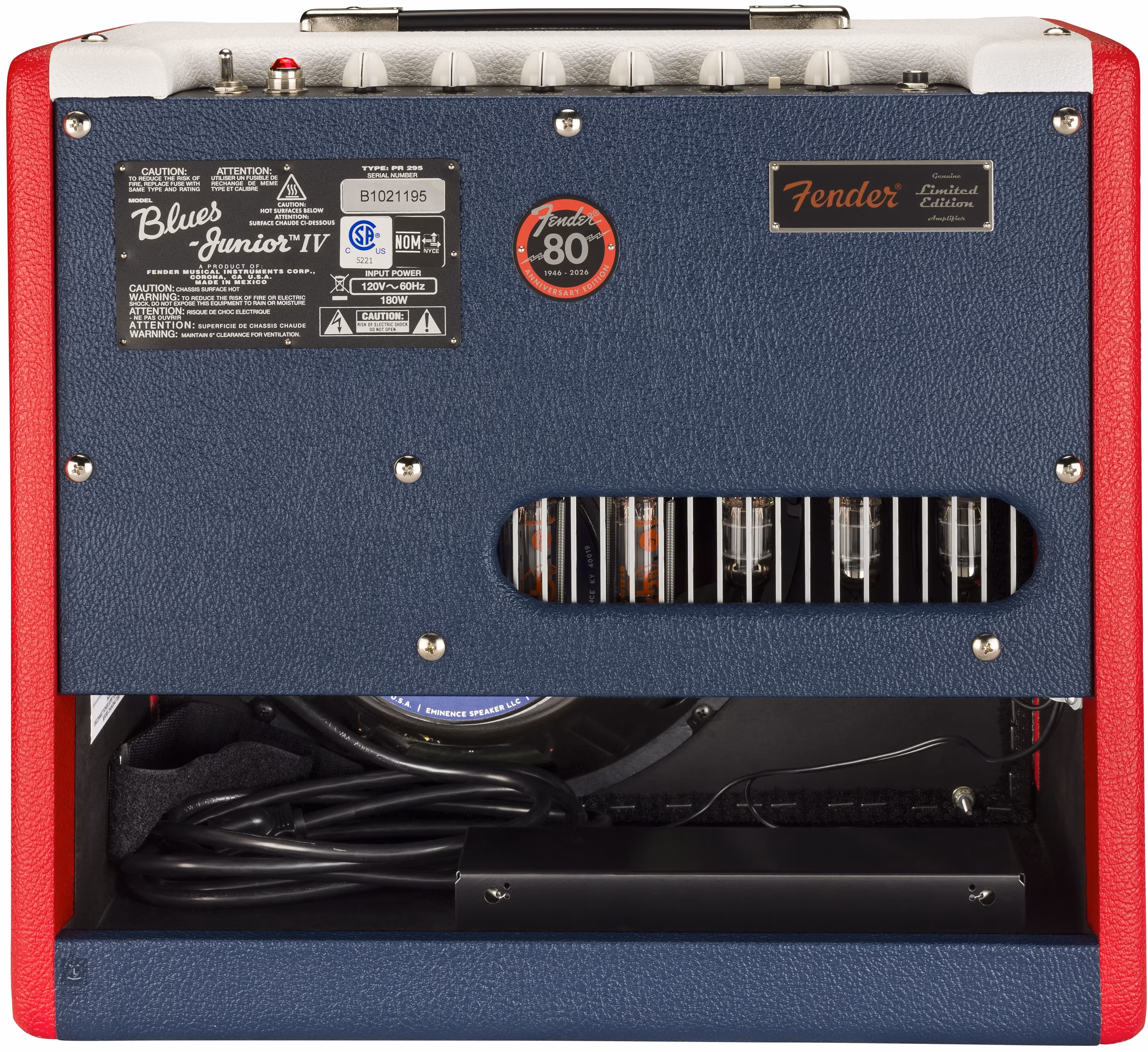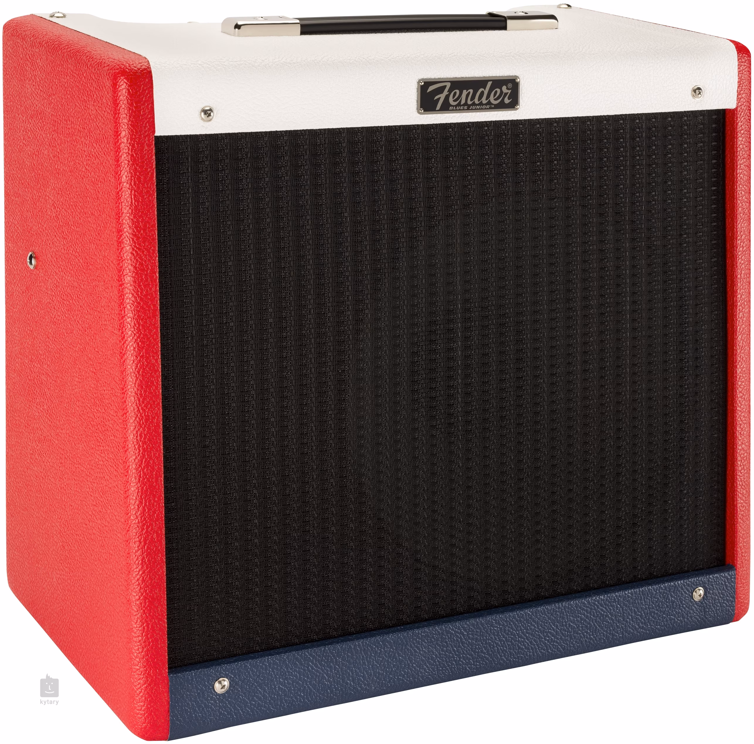 Limitowana edycja lampowego komba Blues Junior IV Colour Trio FSR ma nie tylko nowy stylowy wygląd w postaci winylowej obudowy w kolorze niebieskim, czerwonym i białym oraz czarnej przedniej kratki akustycznej, ale oferuje również zmianę w postaci zmodyfikowanego obwodu przedwzmacniacza i cieplejszego brzmienia sprężynowego pogłosu.