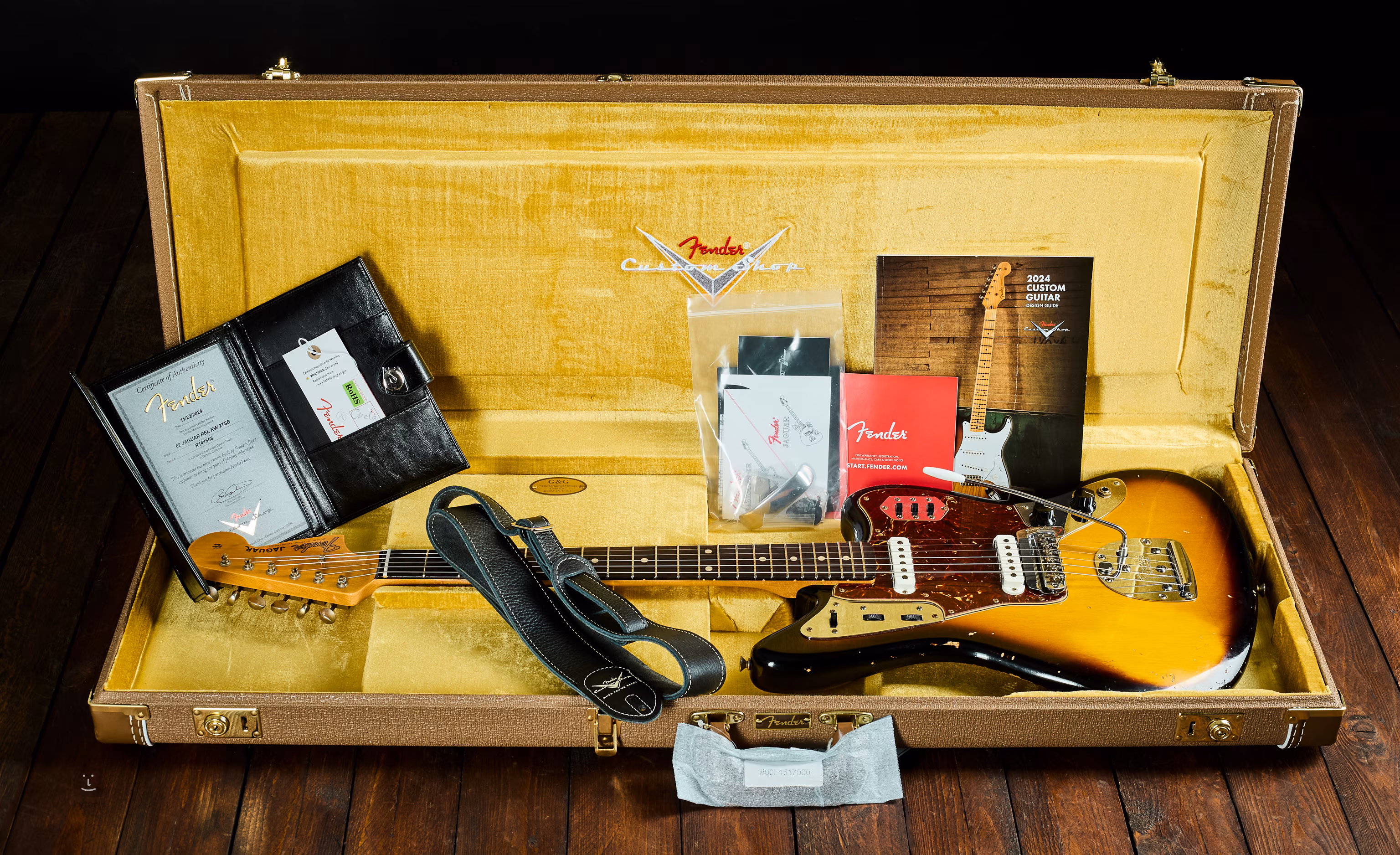 Fender Custom Shop 1962 Jaguar Relic 2TSB z serii Time Machine – wierna replika legend z lat 60., wykonana dawnymi metodami i wykończona tak, aby realistycznie oddać wiek i zużycie. Korpus z olchy, Relic patyna z drobnymi obiciami i rysami. Klonowy gryf z podstrunnicą z palisandru klasy AAA, 22 progi Vintage Upgrade (45085), markery z micarty. Dwa przetworniki vintage-style Jaguar, łatwo „rozkręcają” lampę do ciepłego overdrive. Przełączanie obwodów Rhythm/Lead, klasyczne potencjometry i slidery. Klucze w stylu vintage i tremolo Jaguar.