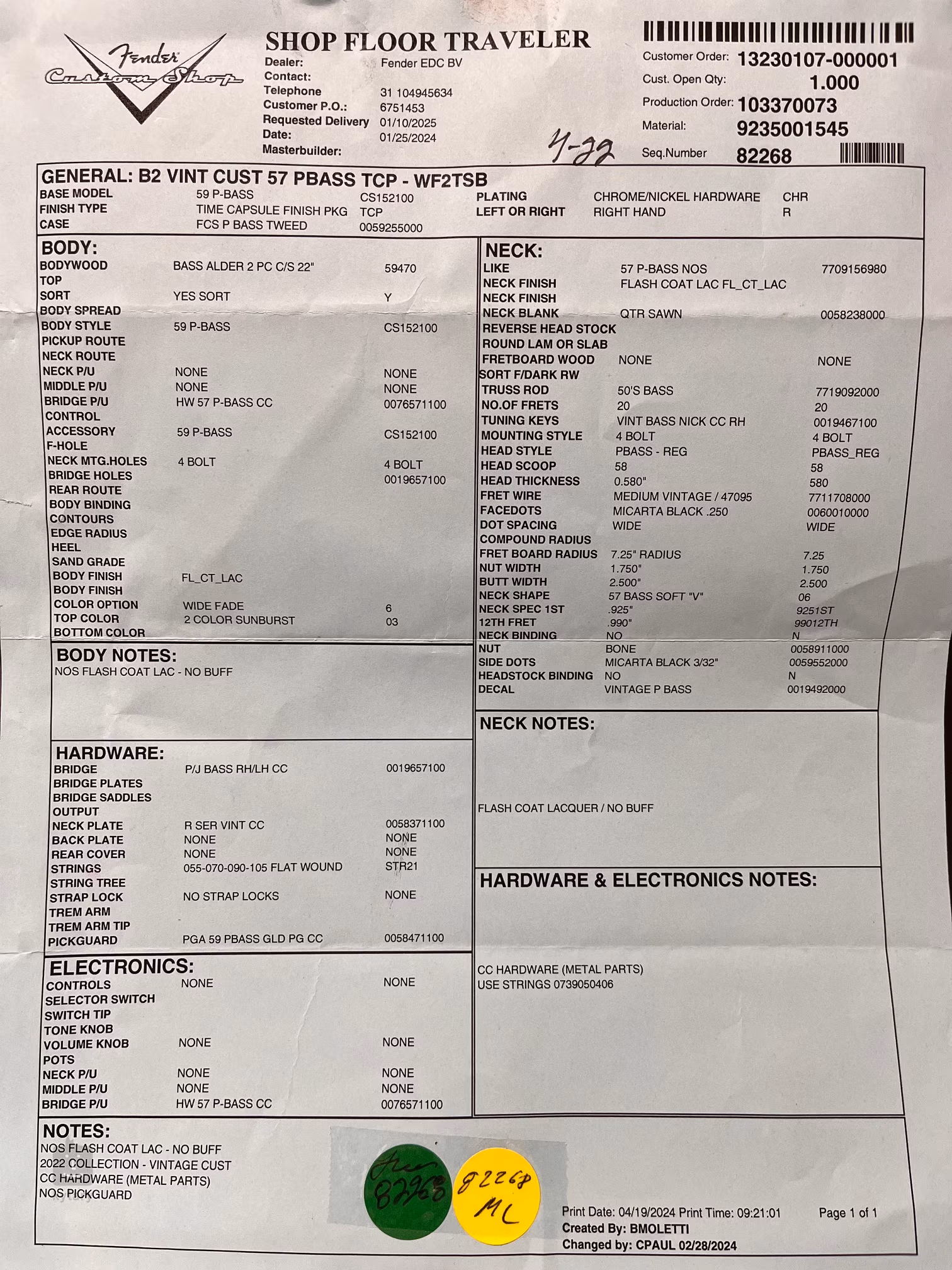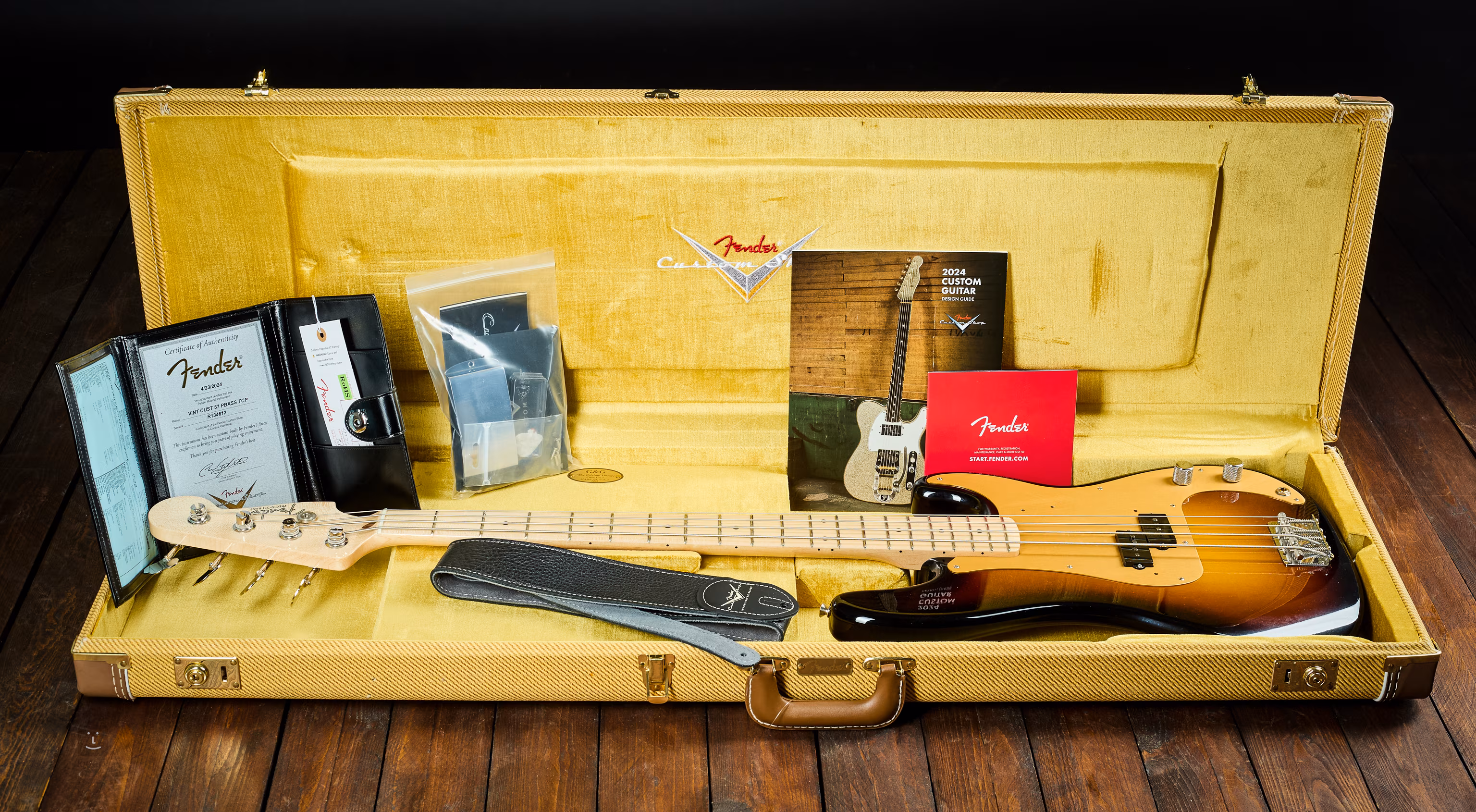 Ta replika modelu Precision z 1957 roku posiada typowe specyfikacje: gryf wykonany jest z jednego kawałka klonu w przekroju „quartersawn” i posiada 20 progów „medium vintage”; promień 7,25”, profil 57 Bass Soft V. Prog zerowy z kości ma szerokość 44 mm. Przetwornik to ręcznie nawijany, całkowicie klasyczny split-coil (Handwound 57 P-Bass). Osłona przetwornika jest aluminiowa w kolorze złotym.