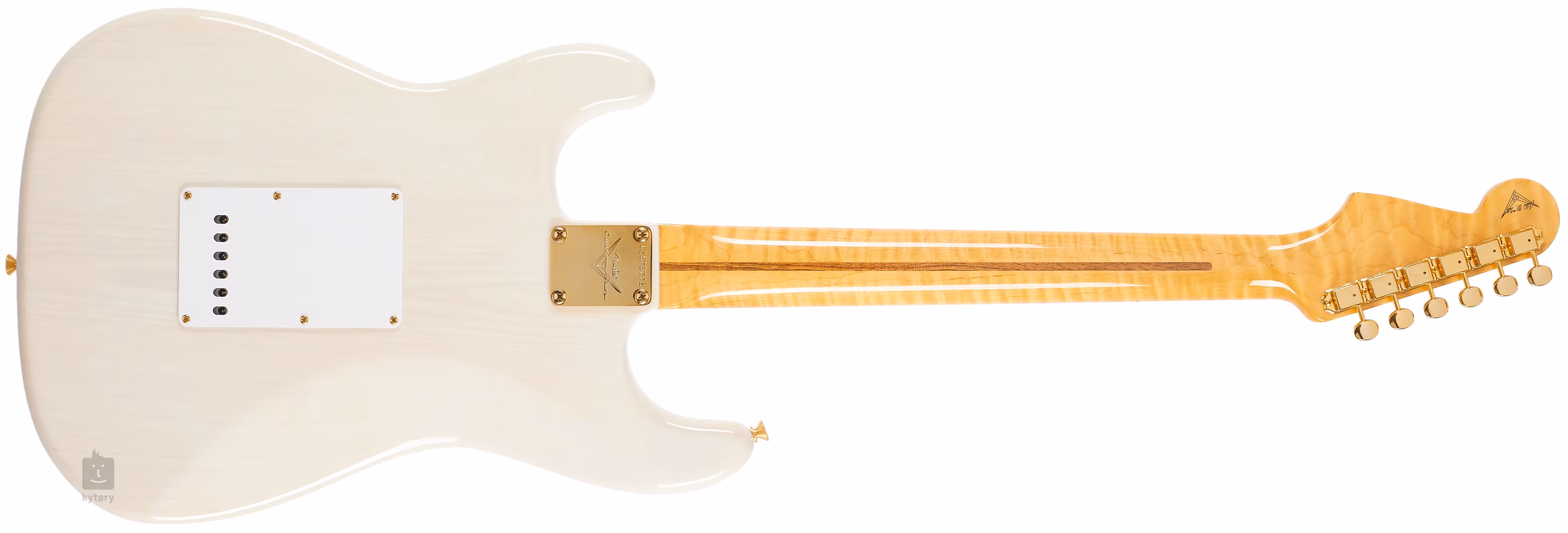 Trio ręcznie nawijanych przetworników Strat 56 z pojedynczą cewką zapewnia charakterystyczne brzmienie gitary Strat. Kontury brzmienia można regulować za pomocą standardowych pokręteł. Struny są zamontowane na kościanej podstrunnicy w stylu vintage z maszynkami do strojenia i zsynchronizowanym tremolo Strat. Stylowe wykończenie jest podkreślone przez pickguard 54-58 Eggshell i złoty osprzęt.