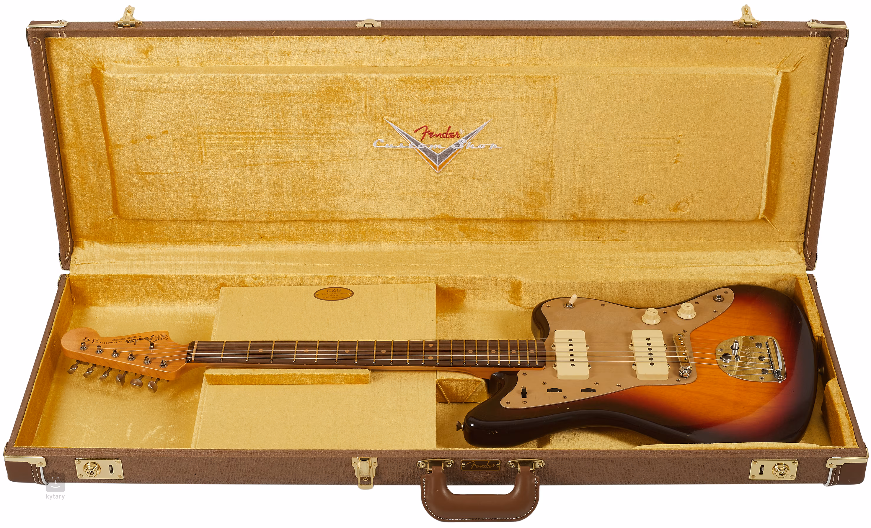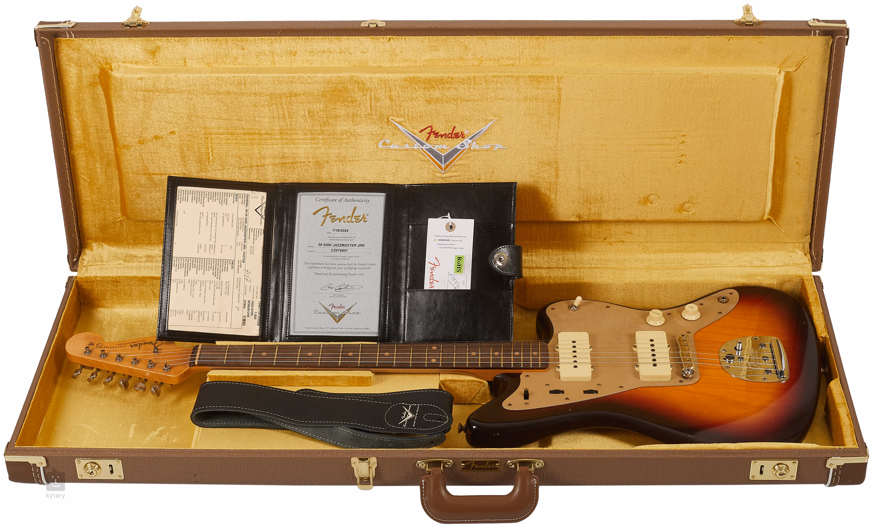 Inne wysokiej jakości funkcje obejmują strunnik Fender "pływający vibrato" z nowoczesnym mostkiem Custom Shop RSD (Research Special Design) dla lepszego podtrzymania i stabilności strojenia, tunery w stylu vintage, drzewo strun skrzydłowych, luksusowy futerał z twardą skorupą, pasek i certyfikat autentyczności.