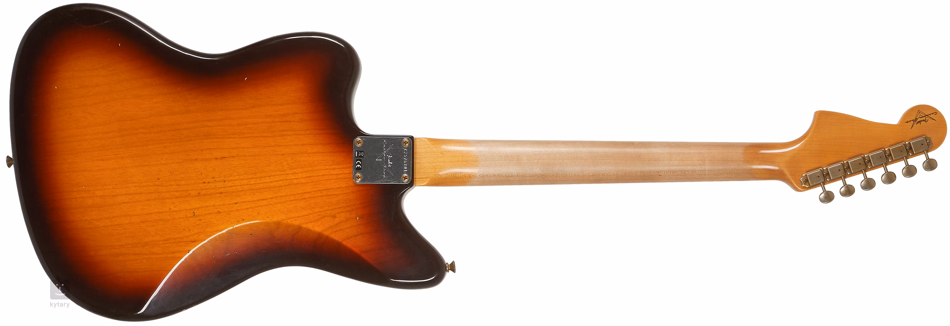 Klonowa szyjka ma profil "C" w stylu Jazzmastera z 62 roku, zwieńczona palisandrową podstrunnicą o promieniu 9,5 cala z 21 wąskimi progami (6105) i kościaną nakrętką. Aby dodać więcej stylu vintage, zastosowano jednowarstwowy, anodowany na złoto aluminiowy pickguard (ceniona wczesna wizytówka Jazzmastera), dwa ręcznie nawijane przetworniki Custom Shop '62 Jazzmaster z trójdrożnym przełącznikiem przetworników, okablowanie vintage dual-circuit (lead/rhythm) oraz, w specjalnym nowoczesnym akcentem, potencjometry głośności i tonu 250k, które poprawiają brzmienie i grywalność.