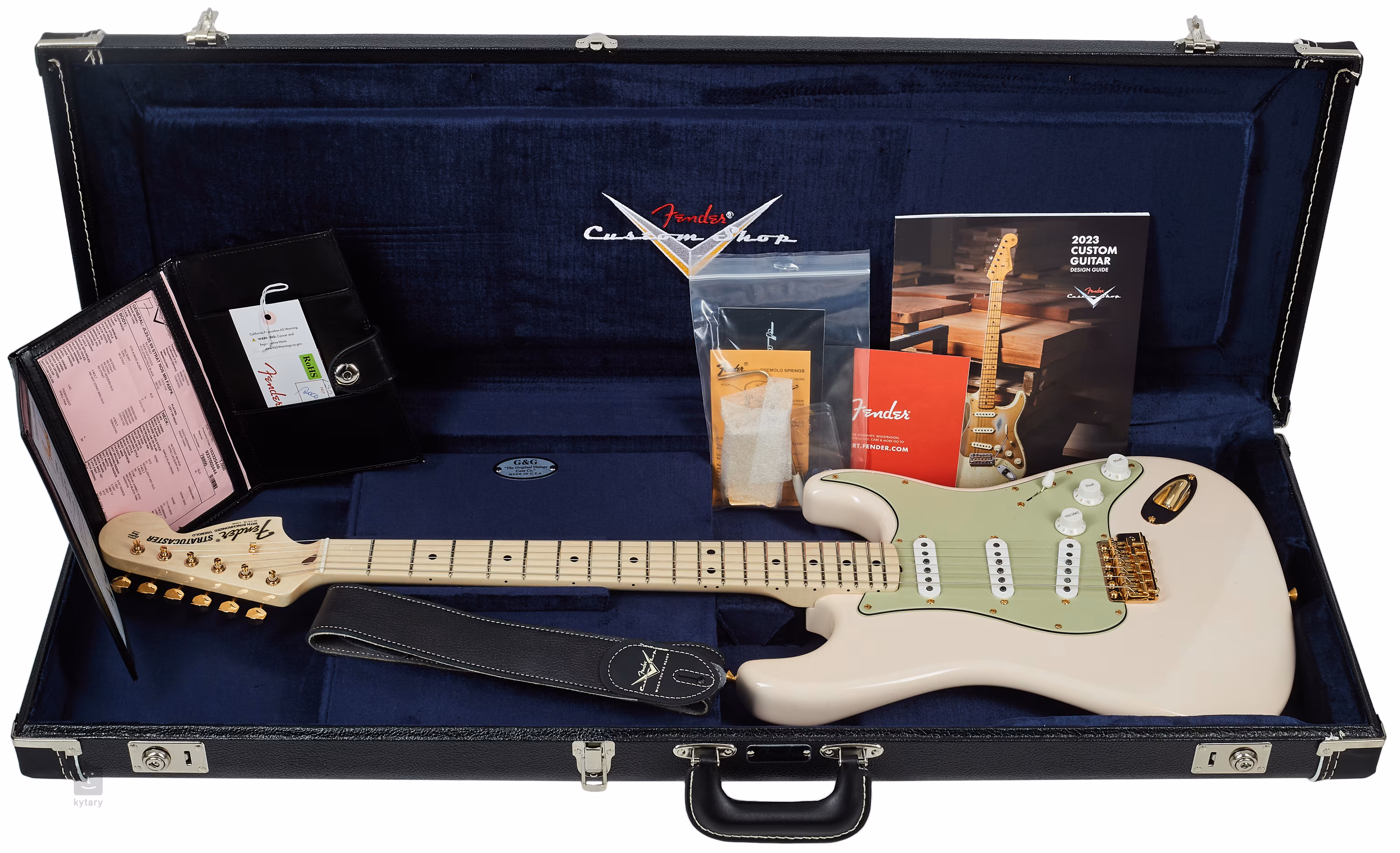 Struny są zakotwiczone przez maszynki do strojenia Schaller i zsynchronizowane tremolo Strat za pomocą progu kostnego. Stylistykę podkreśla pickguard Strat GBG Nitro z lat 63-76 i wykończony na złoto osprzęt.