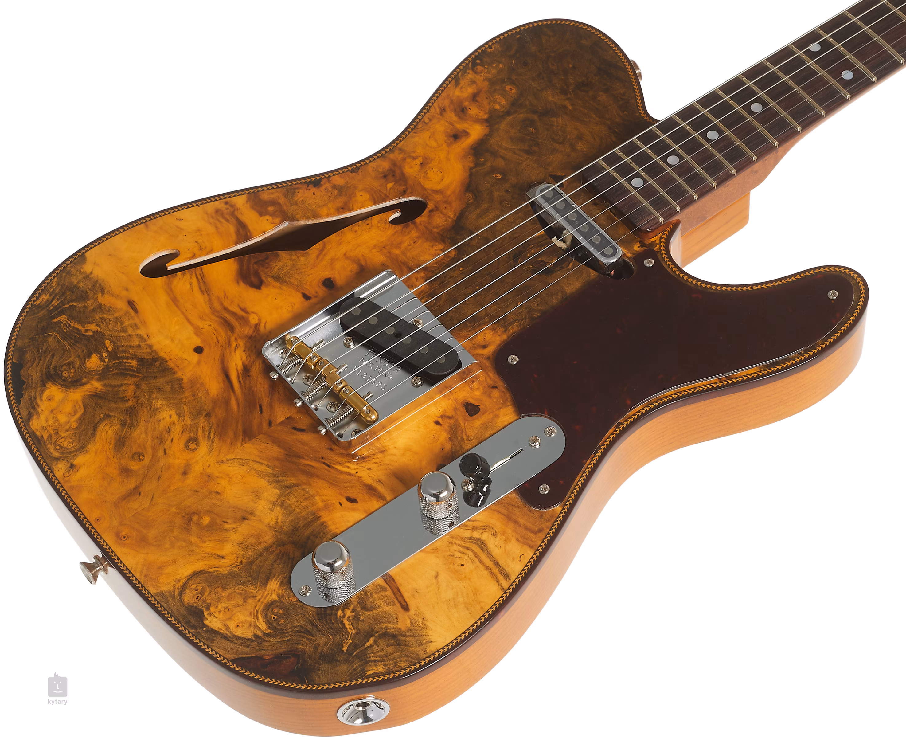 Artisan Buckeye Burl Double Esquire łączy w sobie najlepsze, ręcznie wyselekcjonowane drewno z eleganckim designem, innowacyjnością i udogodnieniami dla graczy, łącząc formę i funkcję w jedno. Wydrążony korpus z palonej sosny i figurowany top z drewna Buckeye Burl są oprawione brązowym bindingiem i lamówką w jodełkę, a wszystko to wykończone lakierem nitrocelulozowym NOS. Szyjka z palonego klonu 3A ma owalny profil "C" w stylu lat 60-tych, zwieńczony palisandrową podstrunnicą o promieniu 9,5 cala z 21 wąskimi progami.