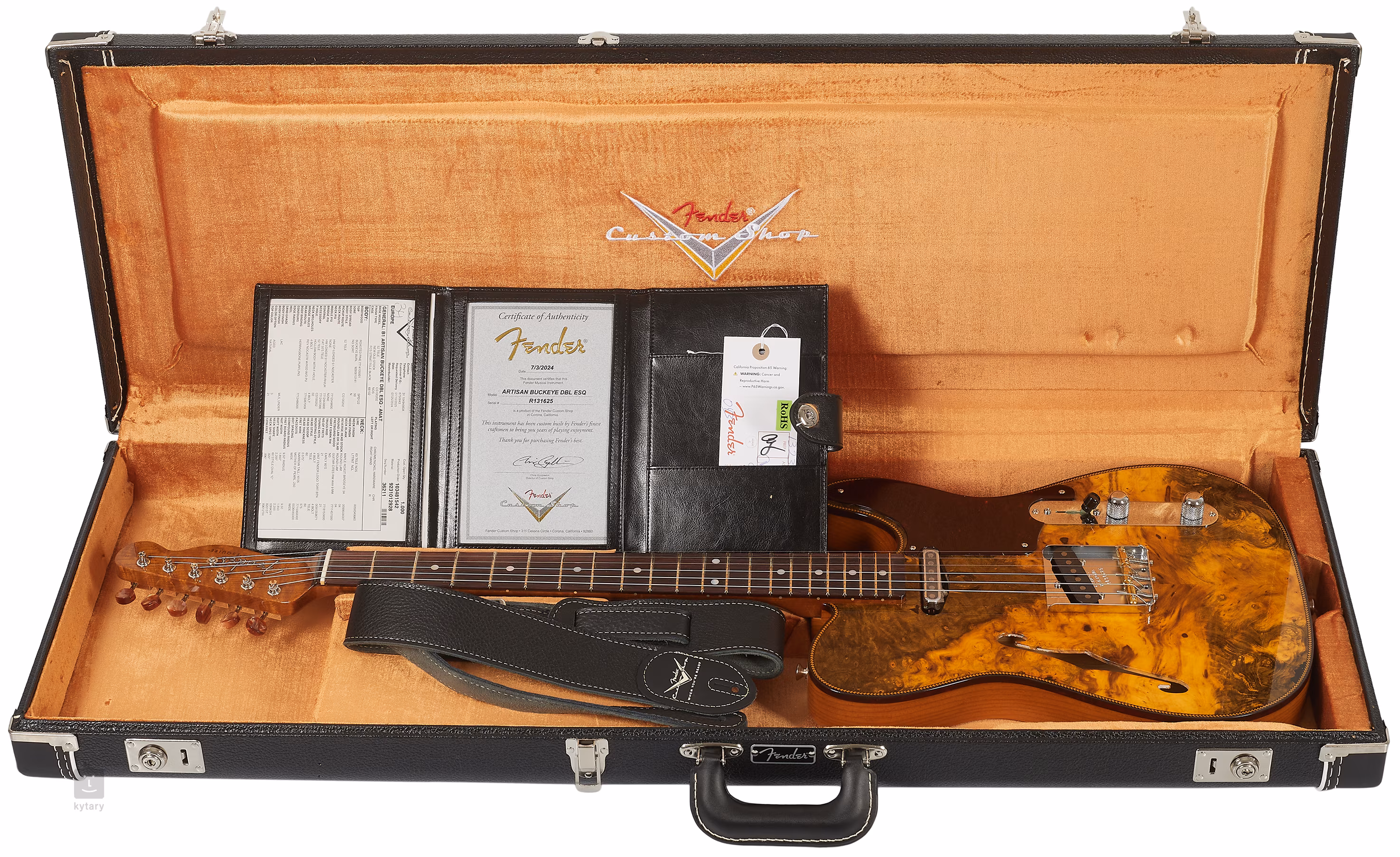 Dodatkowe zalety to jednowarstwowy pickguard "Caballo Tono" z brązowej skorupy, mostek Tele '58-'63 o odwróconym kącie nachylenia z siodełkami RSD, maszynki do strojenia w stylu vintage z przyciskami z brązowej skorupy, kościana nakrętka i tarczowe drzewko strun. Zawiera również luksusowy futerał, pasek i certyfikat autentyczności.
