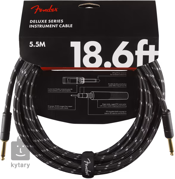 Kabel instrumentalny serii Deluxe jest flagowym produktem firmy Fender. Połączenie wysokiej jakości materiałów i nowoczesnego wzornictwa pozwoliło stworzyć kabel o czystej i przejrzystej transmisji sygnału, doskonałej przewodności i co nie mniej ważne, gwarancji długiej żywotności. Pozłacane 24-karatowym złotem złącza gwarantują doskonałe brzmienie, a wytrzymała powierzchnia Tweed zapewnia doskonałą ochronę przed uszkodzeniami. W zestawie znajduje się opaska rzepowa.