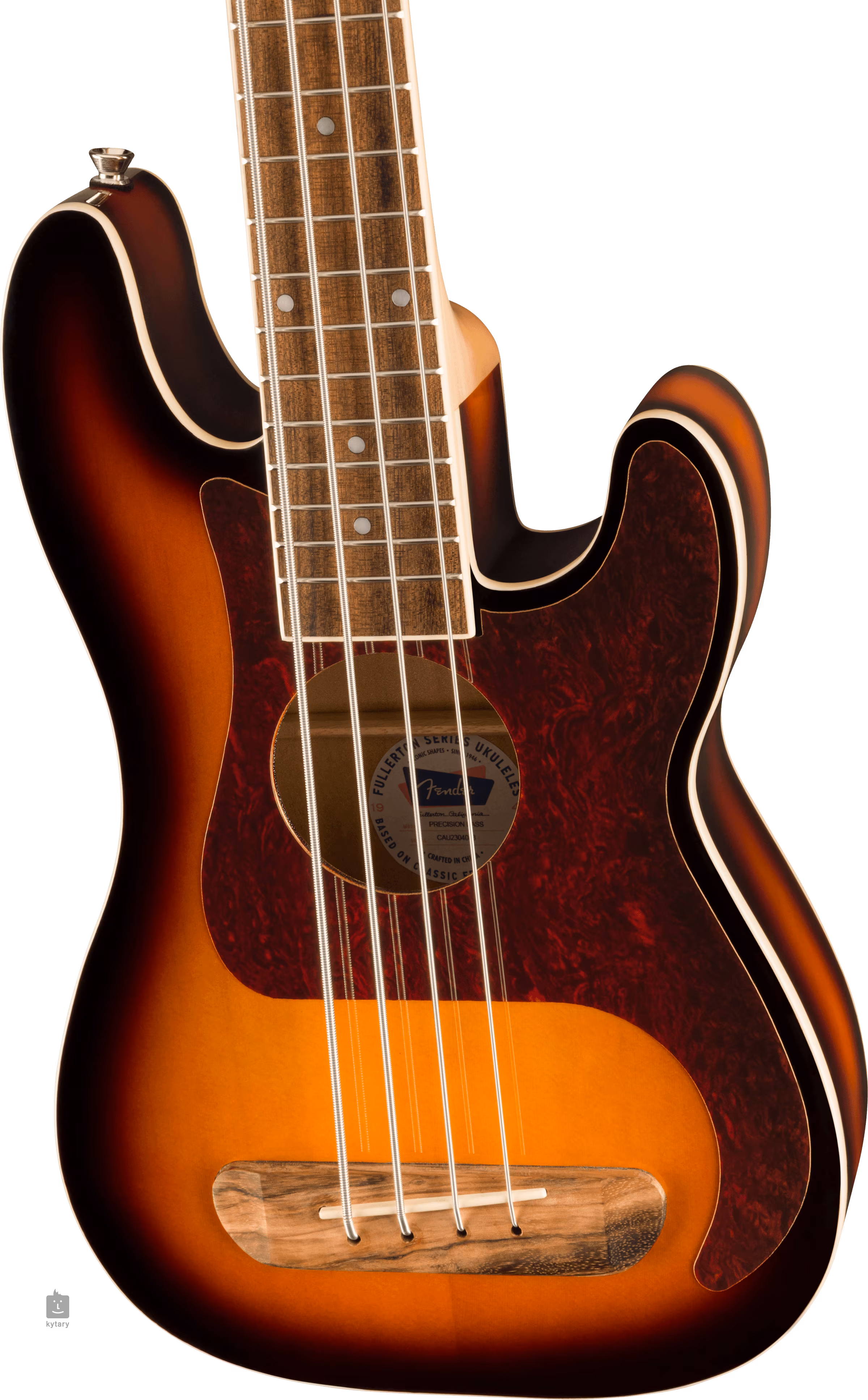 Fullerton Precision Bass Uke łączy kompaktowy kształt ukulele z konstrukcją korpusu basu Fender Precision. Korpus instrumentu wykonany jest z laminowanego świerku z przodu oraz litego drewna okoumé z tyłu i po bokach. Do klonowej szyjki o wygodnym profilu "C" przyklejona jest orzechowa podstrunnica wyposażona w osiemnaście progów. Struny są utrzymywane przez chromowane, odlewane mechanizmy i orzechową podstrunnicę. Stylowe wykonanie podkreśla charakterystyczny pickguard Precision Bass z imitacji skorupy żółwia.
