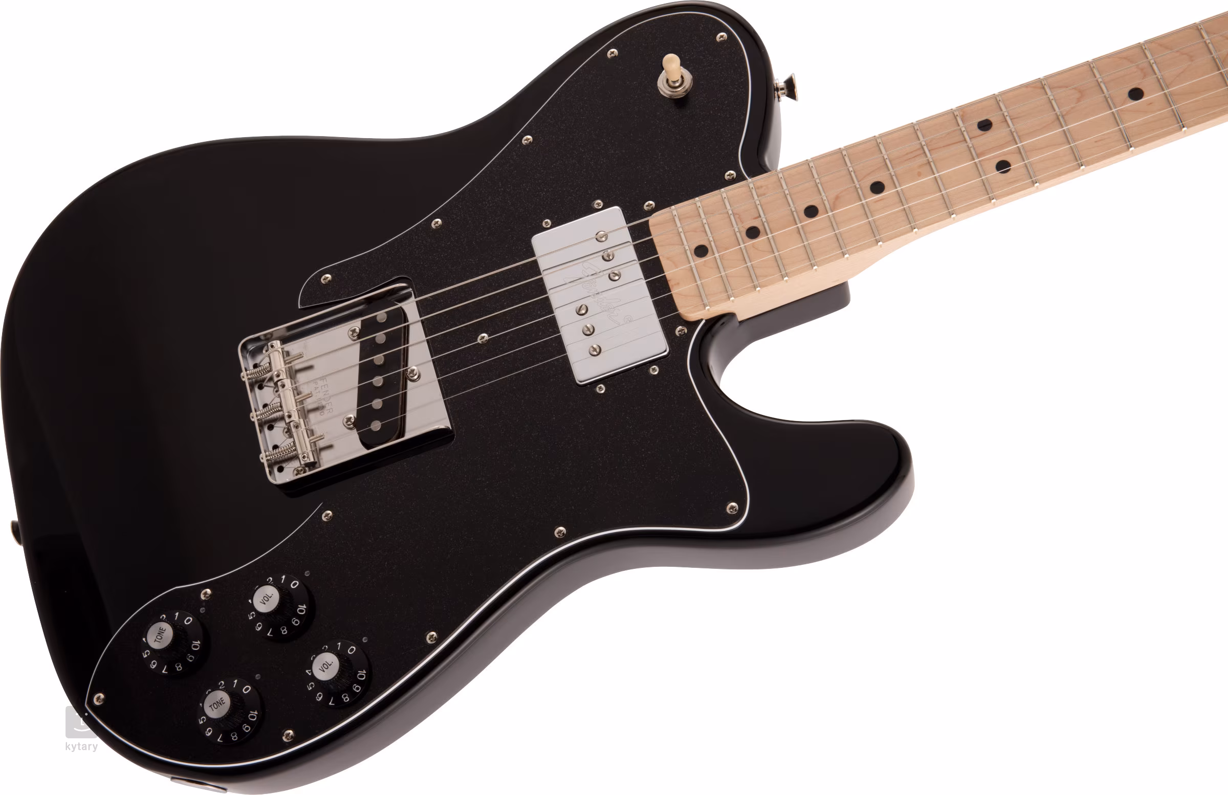 Struny są zamocowane za pomocą kostnego progu zerowego w firmowych mechanizmach w stylu vintage oraz za pomocą mostka Tele z trzema stalowymi siodełkami przechodzącymi przez korpus. Stylowe wykończenie podkreśla czarna, trójwarstwowa osłona i logo Fender Telecaster Custom na główce instrumentu.