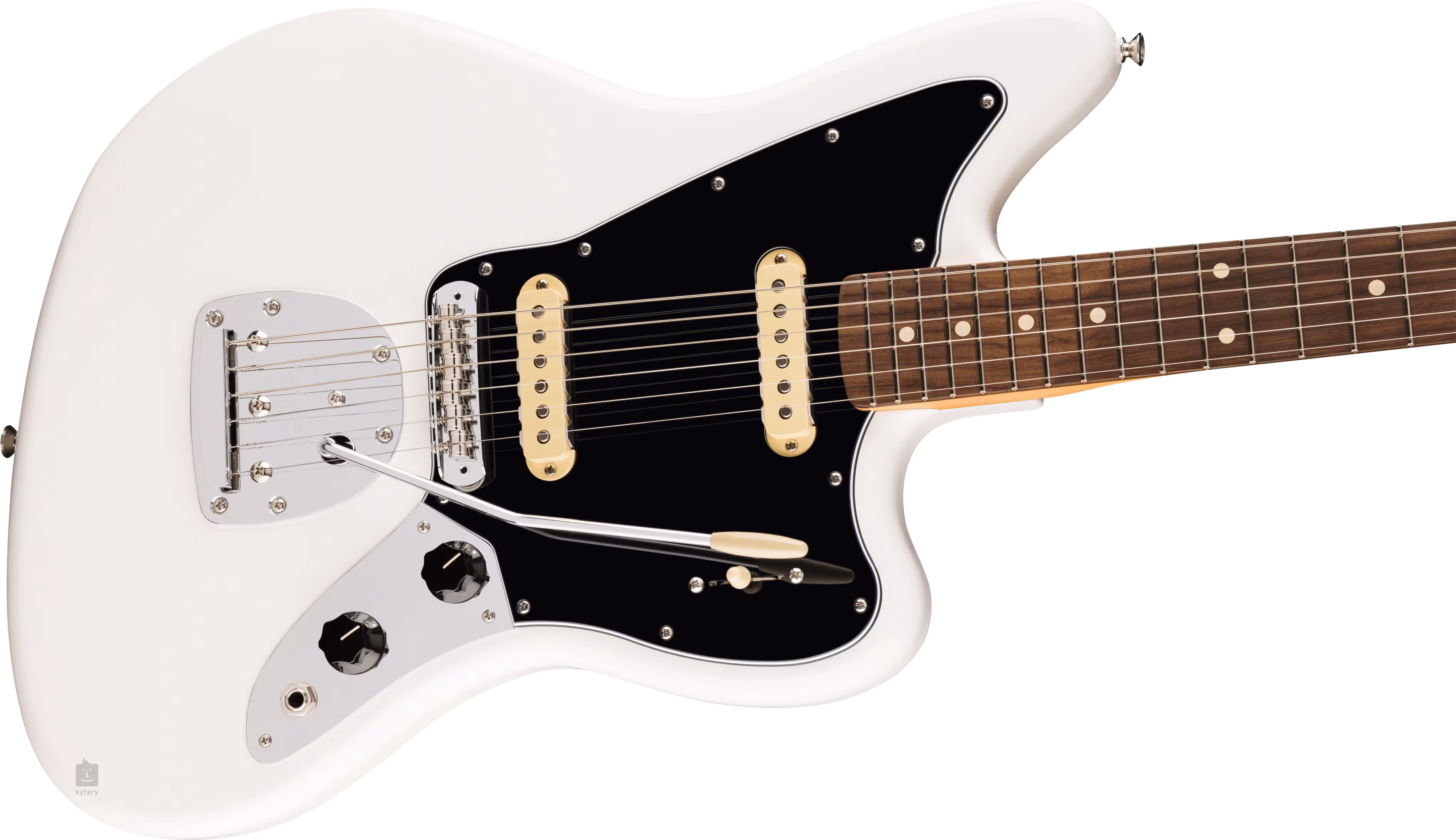Dwa przetworniki jednocewkowe z serii Player z magnesami Alnico 5 i Alnico 2 nadają gitarze bardziej nowoczesny charakter i brzmienie Fendera, które docenisz w szerokim zakresie stylów muzycznych. Charakter brzmienia można regulować za pomocą standardowych pokręteł. Struny są zamontowane w mechanikach ClassicGear z przełożeniem 18:1 i vintage'owymi pływającymi siodełkami tremolo z mosiądzu Mustang na całej podstrunnicy. Stylowy wygląd gitary podkreśla czarny, trzywarstwowy pickguard i wykończenie w kolorze Polar White.