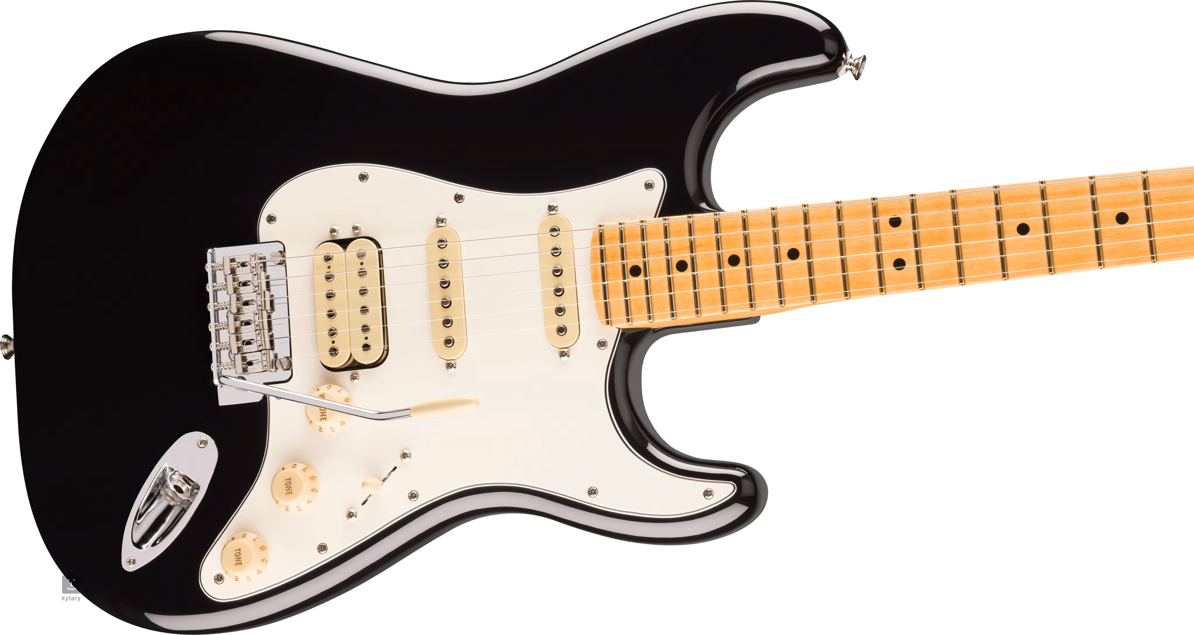 Przetwornik humbucker z serii Player z magnesami Alnico 2 i dwa przetworniki single-coil z magnesami Alnico 5 nadają gitarze bardziej nowoczesny charakter i brzmienie Fendera, które docenisz w szerokim zakresie stylów muzycznych. Charakter brzmienia można regulować za pomocą pokręteł głośności i tonów oraz pięciopozycyjnego przełącznika przetworników. Struny są zamontowane w mechanice ClassicGear z przełożeniem 18:1 i zsynchronizowanym "2-punktowym" tremolo ze stalowymi siodełkami. Stylowy wygląd gitary podkreśla jasny 3-warstwowy pickguard i błyszczące czarne wykończenie.