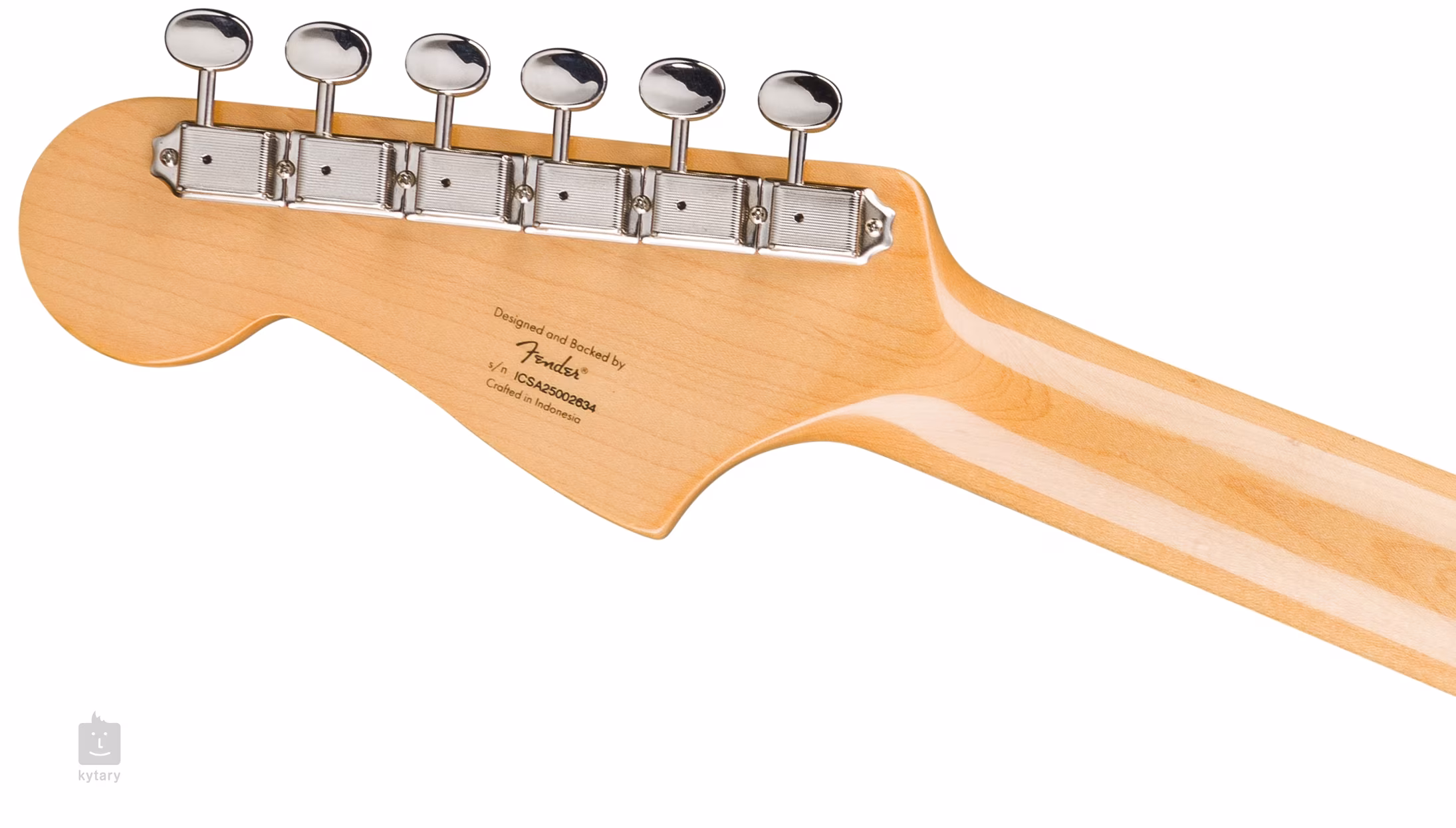 Struny są zamontowane w pływającym tremolo w stylu vintage i firmowych maszynkach do strojenia. Stylowe wykończenie podkreśla czterowarstwowy pickguard z imitacji skorupy żółwia, kolorystyka Burgundy Mist i logo Squier Jazzmaster na główce.
