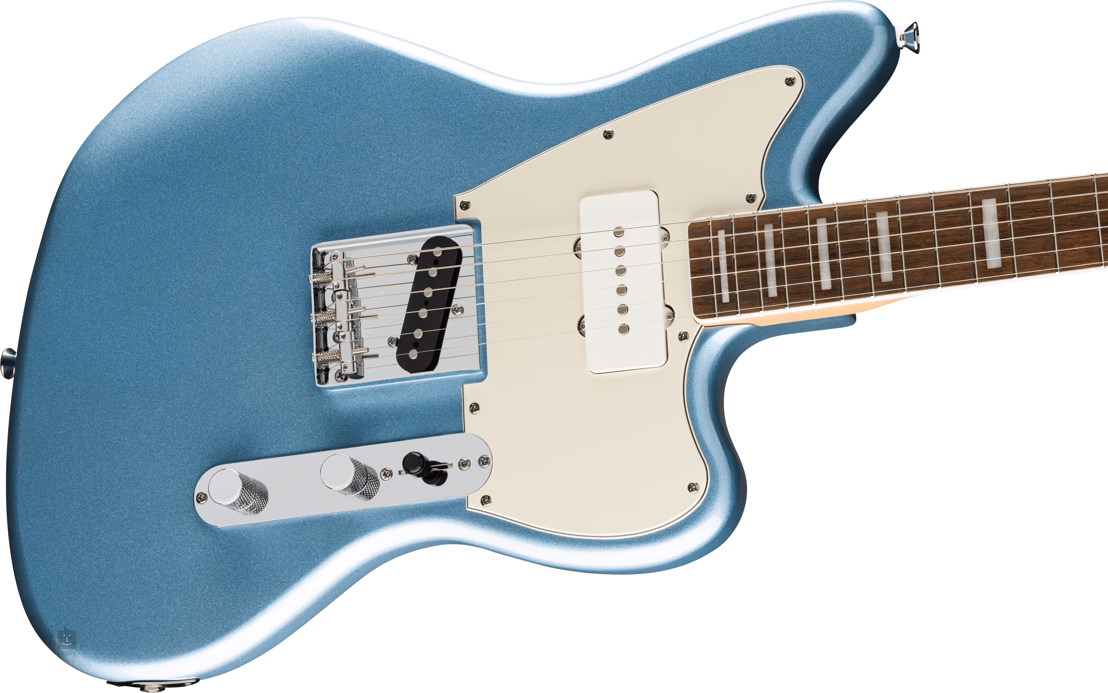 Limited Edition Paranormal Offset Telecaster SJ Ice Blue Metallic to gitara elektryczna z limitowanej serii marki, która łączy w jednym korpusie elementy konstrukcyjne modeli Telecaster i Jazzmaster, od których zaczerpnęła topolowy korpus offsetowy. Wąska klonowa szyjka o profilu "C" jest przyklejona do figuralnej podstrunnicy wyposażonej w dwadzieścia jeden progów Narrow Tall. Orientację podstrunnicy ułatwiają bloki pozycjonujące wykonane z imitacji masy perłowej.