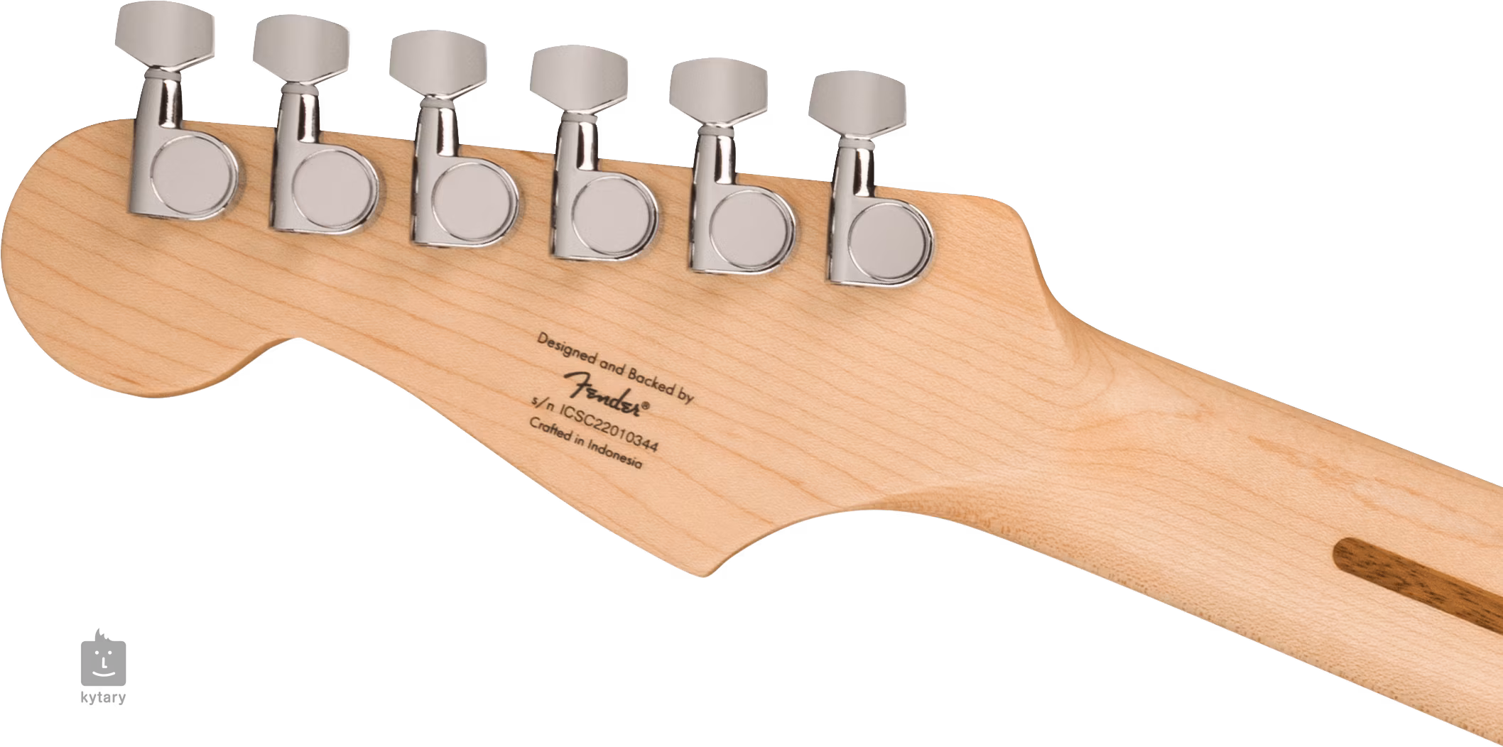Połączenie humbuckera cobbler oraz dwóch przetworników single-coil z magnesami ceramicznymi nadaje gitarze soczyste rockowe i czyste dzwoniące brzmienie modeli Strat. Jego kontury regulujesz potencjometrami volume, dwoma regulatorami tone oraz pięciopozycyjnym przełącznikiem pickupów. Struny zakotwiczone są w firmowych, odlewanych ciśnieniowo maszynkach do strojenia i synchronizowanym tremolo. Stylowy design Strat podkreślają chromowane okucia, czarny jednowarstwowy pickguard oraz logo firmy na główce.