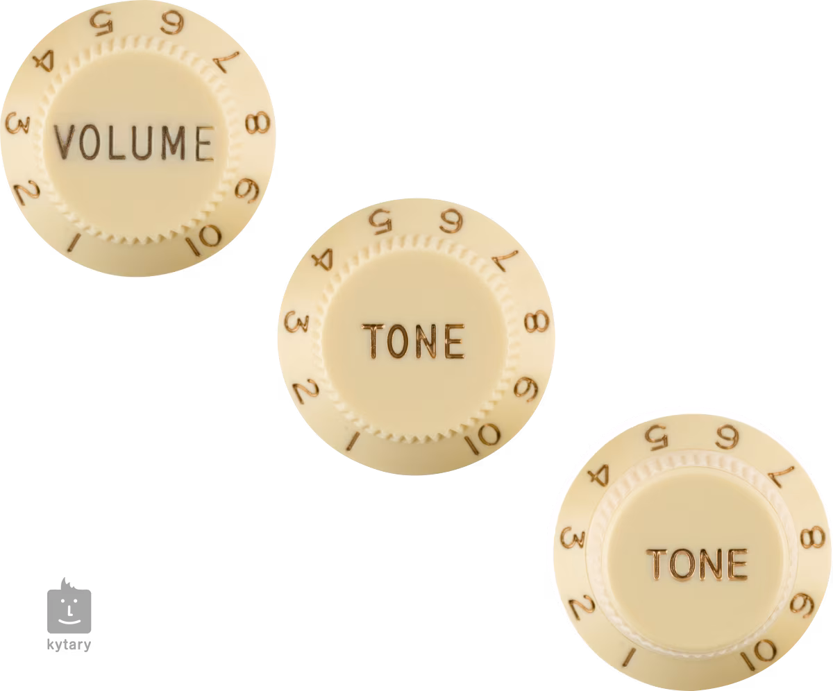Zestaw trzech osłon potencjometrów (1x Volume, 2x Tone) w kolorze Aged White. Odpowiednie dla leworęcznych gitar Stratocaster.