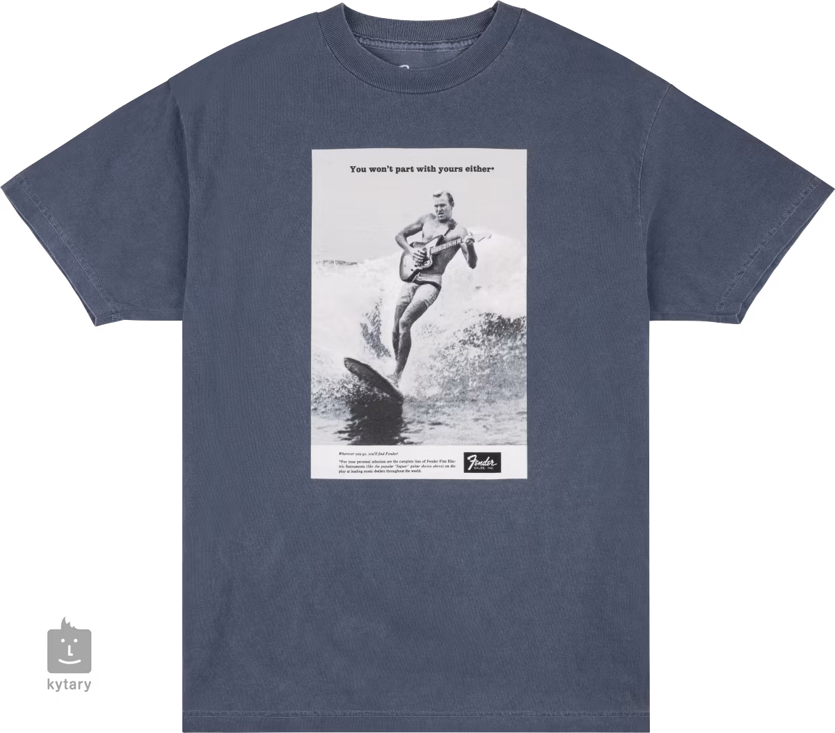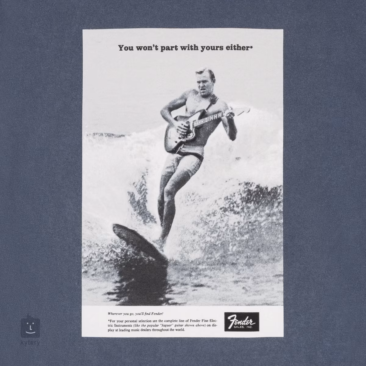 Bawełniana koszulka Vintage Ad Surfer Tee Ocean zawiera motyw z kampanii reklamowej "You won't part with yours either" z lat 60-tych, która przedstawiała muzyków z gitarami Fender w najbardziej nieprawdopodobnych sytuacjach życiowych. Koszulka jest dostępna w różnych rozmiarach.