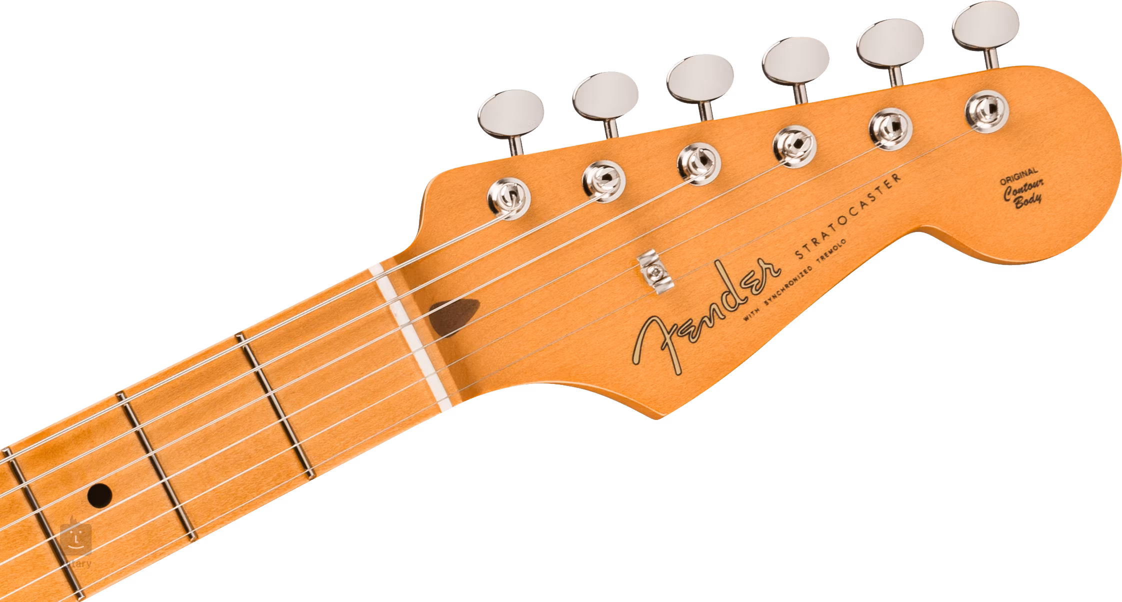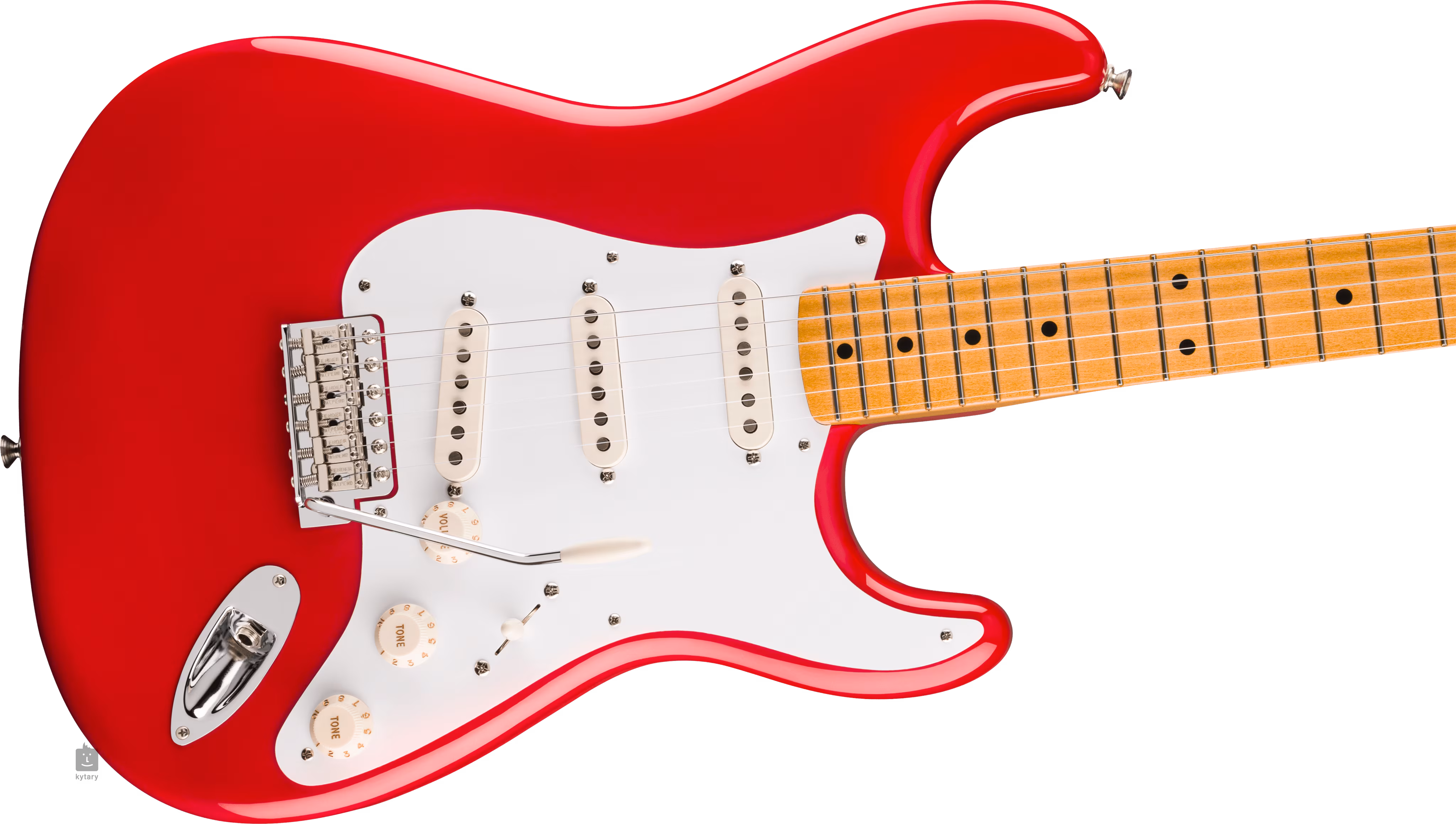 Trio przetworników Vintage-Style Late '50s Single-Coil Strat zapewnia gitarze krystalicznie czysty, dzwonkowy dźwięk z wyraźnie rozpoznawalnym DNA Fendera. Kontury dźwięku można regulować za pomocą pokręteł głośności, tonu i pięciopozycyjnego przełącznika przetworników. Struny są zamocowane przez zerowy próg z kości w firmowych stroikach w stylu vintage i zsynchronizowanym tremolo z sześcioma stalowymi siodełkami. Stylowe wykończenie podkreśla biały, jednowarstwowy pickguard.