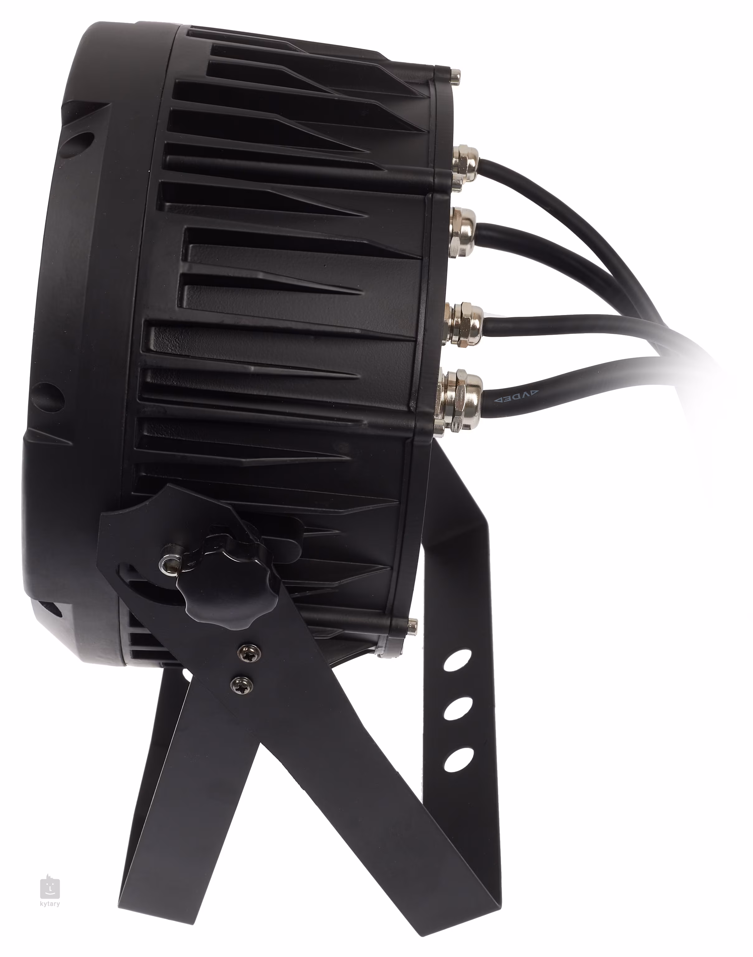 Urządzenie wykonane jest z wytrzymałego, wytłaczanego aluminium. W zestawie znajdują się uchwyty montażowe, które można wykorzystać do montażu na konstrukcji scenicznej lub jako stojaki po umieszczeniu na ziemi.