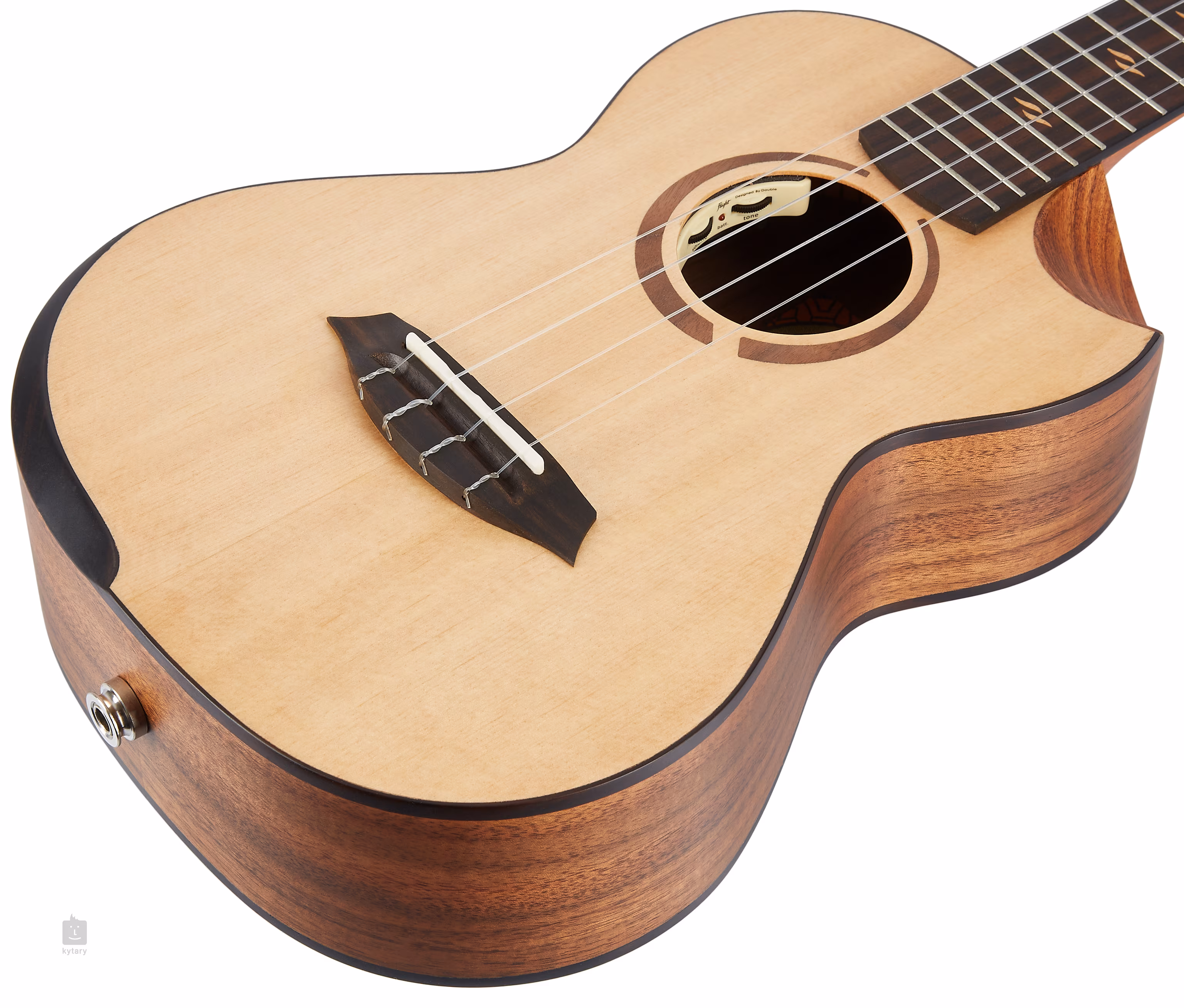Przedni blat ukulele tenorowego Victoria wykonany jest z litego świerku Sitka, podczas gdy tylna część tylnej części wykonana jest z laminowanej akacji, która łagodzi przeszywający świerkowy blat. Materiał szyjki i podstrunnicy to wypróbowane i przetestowane drewno, afrykański mahoń i heban, stosowane w instrumentach premium. Komfort gry jest podniesiony na wyższy poziom dzięki elementom konstrukcyjnym w postaci precyzyjnie dobranego wycięcia w dolnej części korpusu i hebanowego podłokietnika. Struny trzymane są w firmowej mechanice i hebanowej podstrunnicy poprzez kompensowane siodełko i kościaną podstrunnicę. Ładne wykonanie podkreślają ozdobne znaczniki pozycji na podstrunnicy i klasyczna konstrukcja główki ze szczelinami.