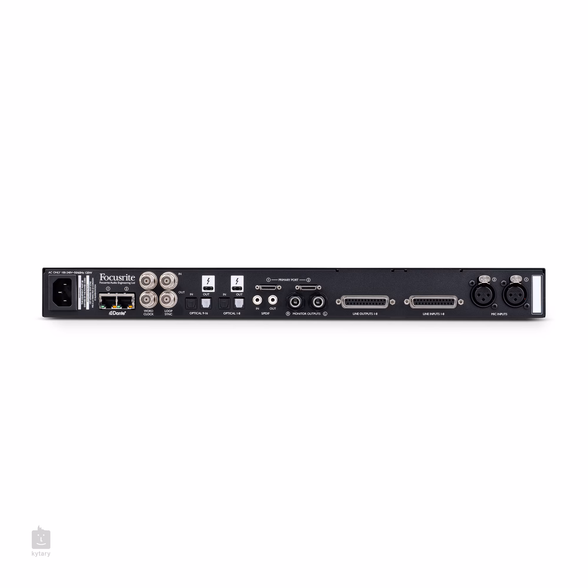 2x XLR (mic), 2x Jack 6.3 mm (HiZ), Sub D25 (8x line), 2x RJ45 Dante, 2x ADAT, 1x S/PDIF, 2x Word Clock BNC coax, 2x HDX