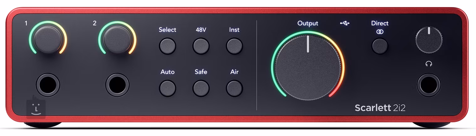 Focusrite Scarlett 2i2 4th Generation to dwukanałowe złącze audio USB-C, które oferuje dwa przedwzmacniacze mikrofonowe lub dwa wejścia dla sygnałów liniowych i instrumentalnych, jedno wyjście stereo do podłączenia monitorów odsłuchowych i jedno wyjście słuchawkowe.