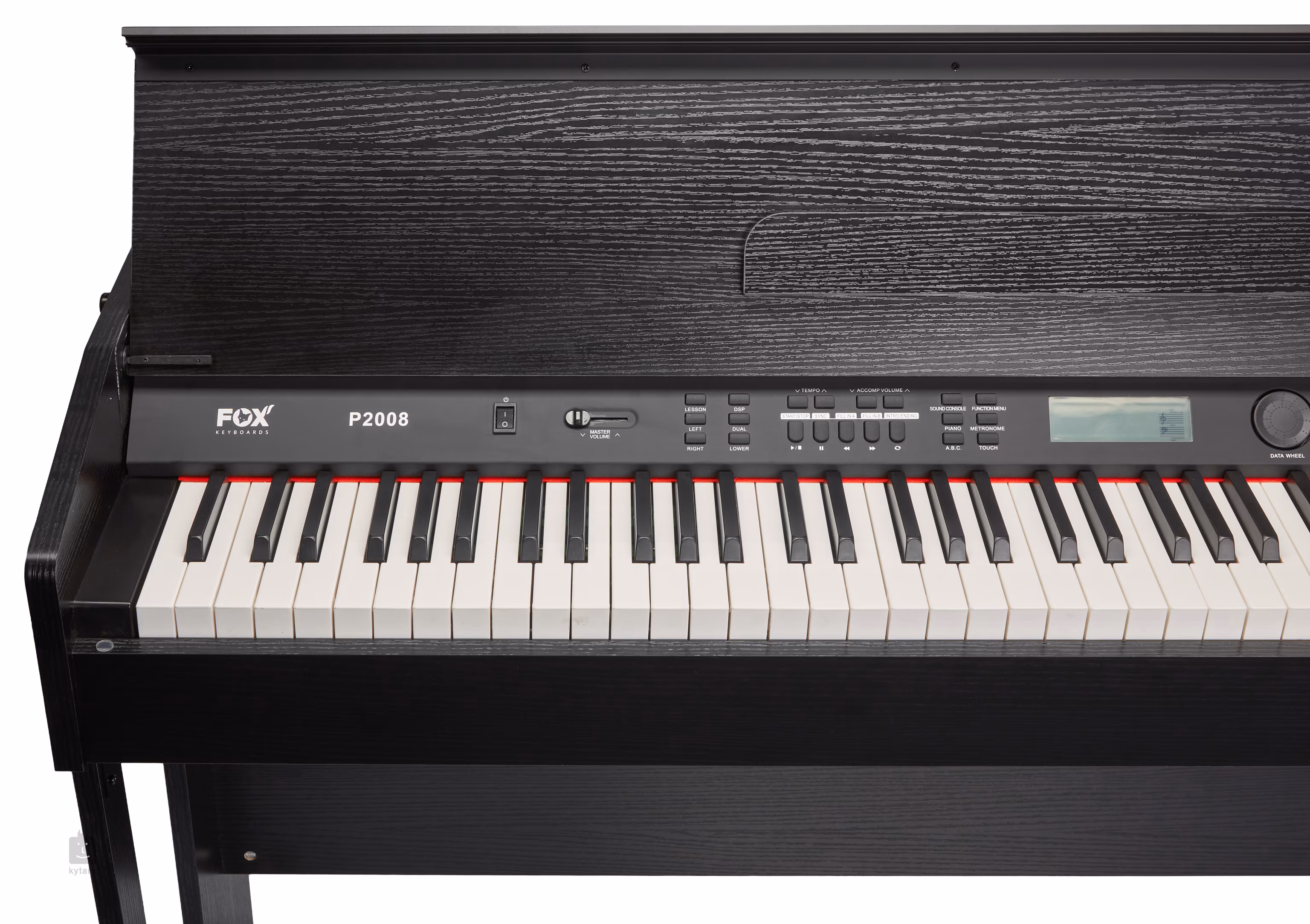 FOX P2008 oferuje 88 standardowych klawiszy z dynamiką, cztery grupy perkusyjne, jednostkę efektów DSP, czytelny wyświetlacz LCD, 360 dźwięków, 160 automatycznych akompaniamentów i 80 utworów demo. Dostępne są również zaawansowane funkcje, takie jak Split (dzielenie klawiatury w celu grania na dwóch instrumentach jednocześnie), Dual Voice (nakładanie warstw dźwięków) oraz ustawienia Sustaine (pogłos) i Vibrato. Klawiaturę można również transponować, co docenią zarówno początkujący, jak i zaawansowani gracze. Oczywiście nie zabrakło opcji grania akordów jednym palcem, funkcji Record do nagrywania swoich prób do trzech ścieżek czy metronomu i systemu samouczków. Do klawiszy dołączone jest zewnętrzne urządzenie z ulubionymi nagraniami do jammowania. Dzięki wejściu/wyjściu MIDI klawisze mogą być również używane jako kontroler oprogramowania muzycznego, a wyjście słuchawkowe pozwala grać do nocy. W zestawie znajduje się trzypedałowy pedał soft i sustain.