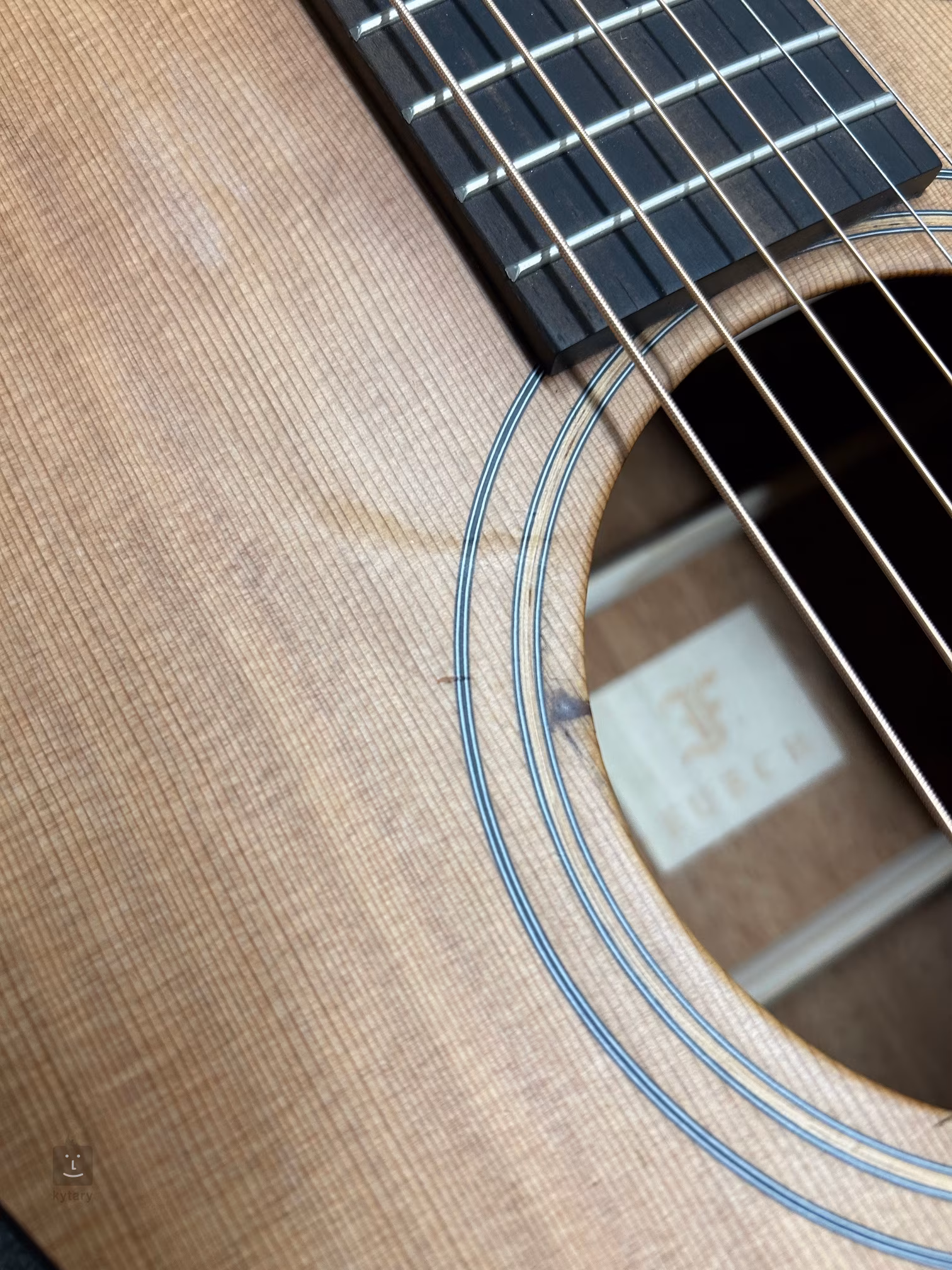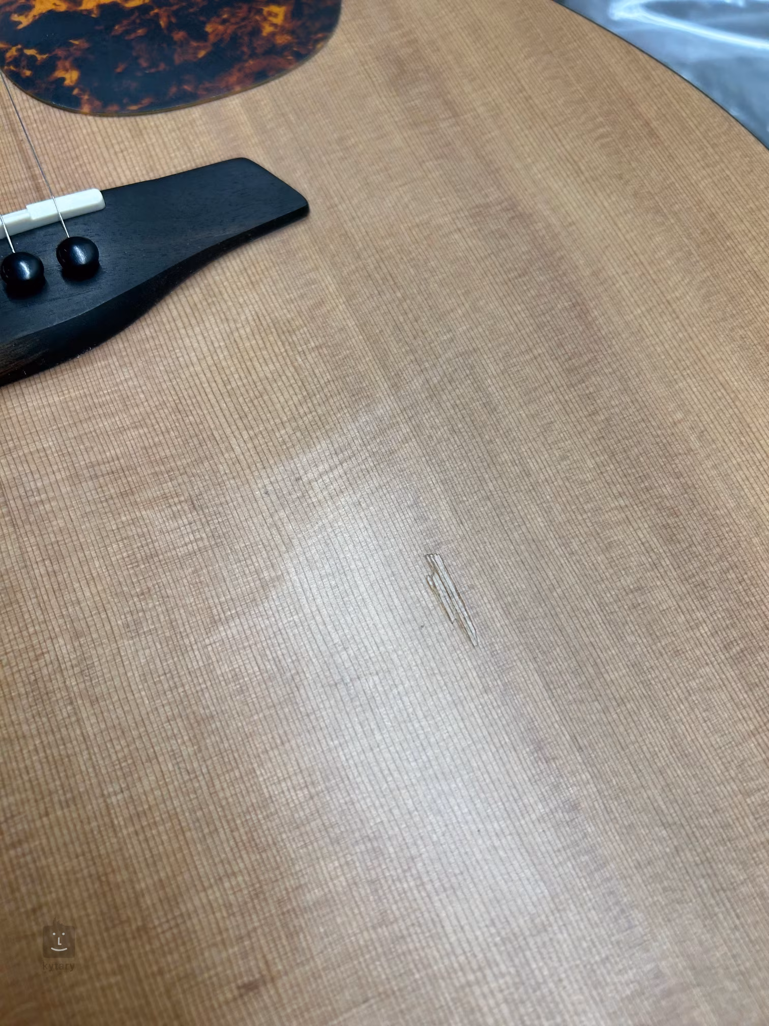 Uszkodzenie powierzchni płyty rezonansowej i za płytą rezonansową (patrz zdjęcie). Poza tym instrument jest w dobrym stanie i w pełni funkcjonalny.