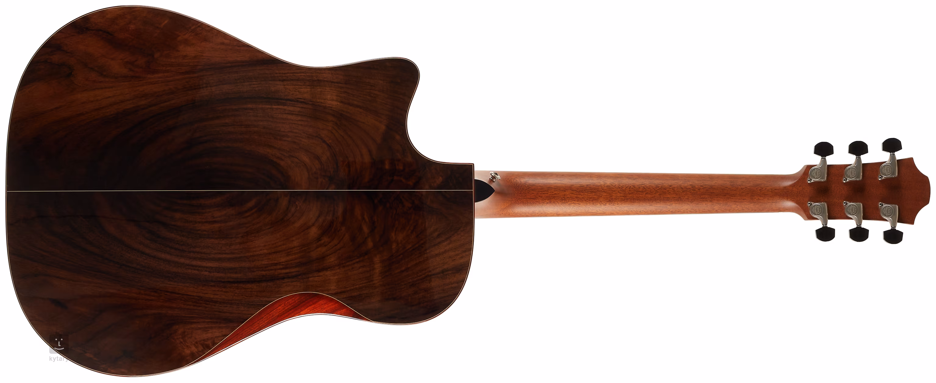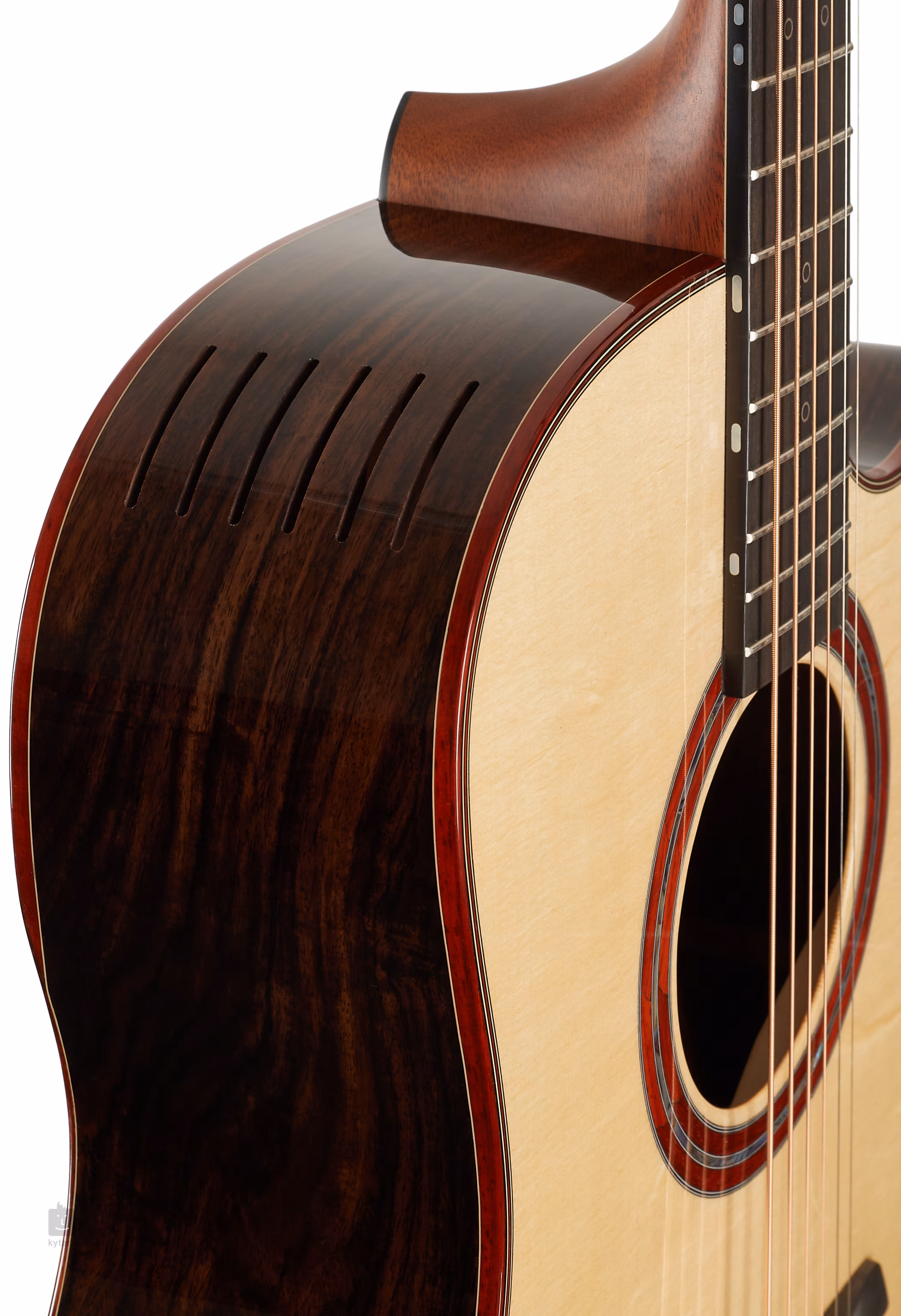Płyta rezonansowa modelu deluxe Dreadnought Rainbow Dc-LR wykonana jest z wyselekcjonowanego świerku alpejskiego, natomiast tył i boki z najwyższej jakości palisandru indyjskiego. Wykończenie Full-Pore High-Gloss, czyli lakierowanie na wysoki połysk, poprawia właściwości akustyczne gitar, zapewnia doskonałą ochronę powierzchni i podkreśla naturalną fakturę drewna. Nowa ergonomiczna funkcja Bevel Duo zapewnia maksymalny komfort nawet podczas długiej gry.