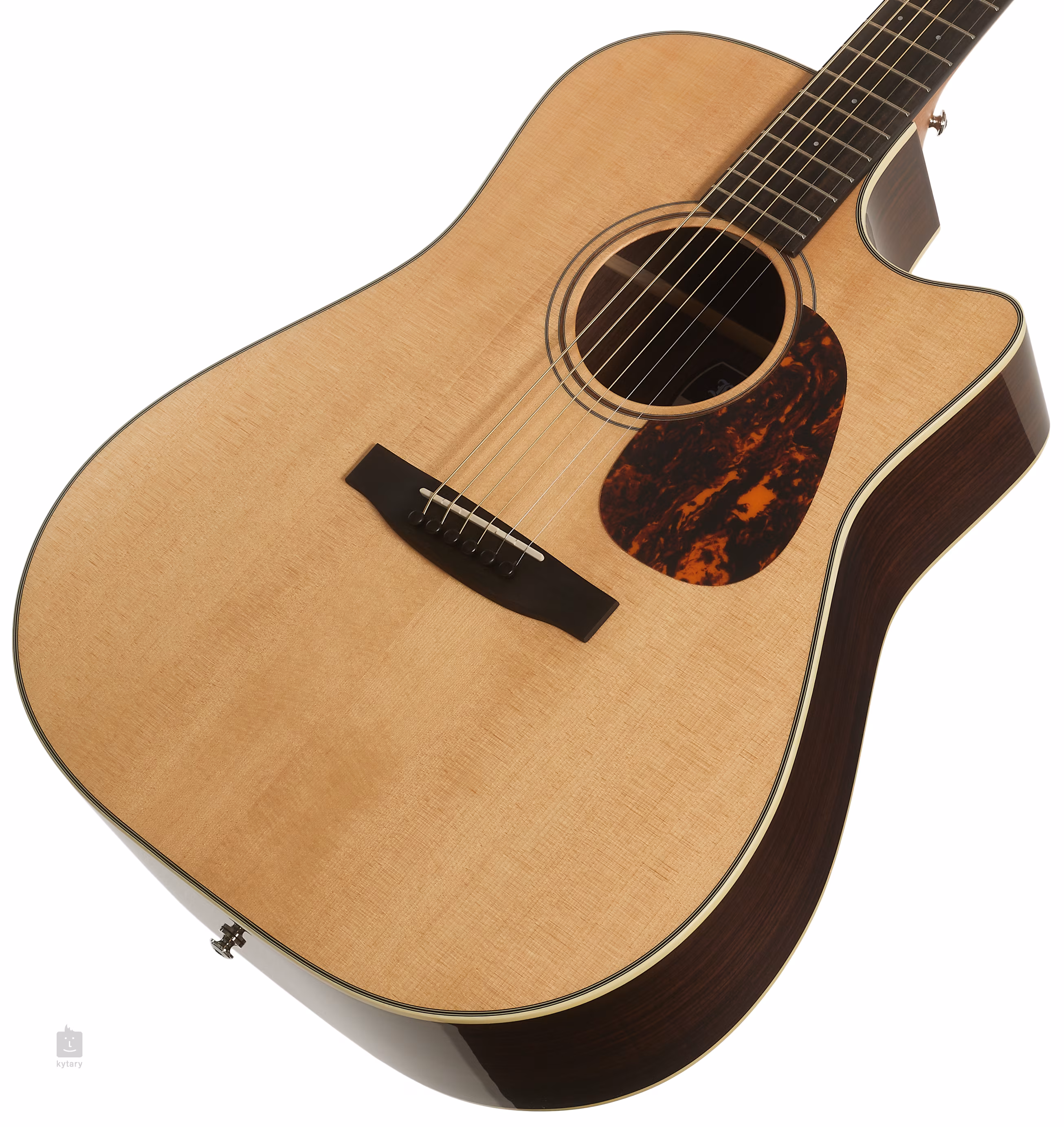 Orientację na hebanowej podstrunnicy ułatwiają boczne i przednie znaczniki pozycji z białej masy perłowej. Stabilne strojenie gwarantuje najwyższej klasy mechanika Gotoh SE700 Nickel patina z przełożeniem 1:15. Atrakcyjny wygląd gitary podkreśla binding korpusu ze sztucznej kości słoniowej oraz rozeta składająca się z podwójnego pierścienia z wkładką z orzecha włoskiego i kontrastującymi czarno-białymi liniami.