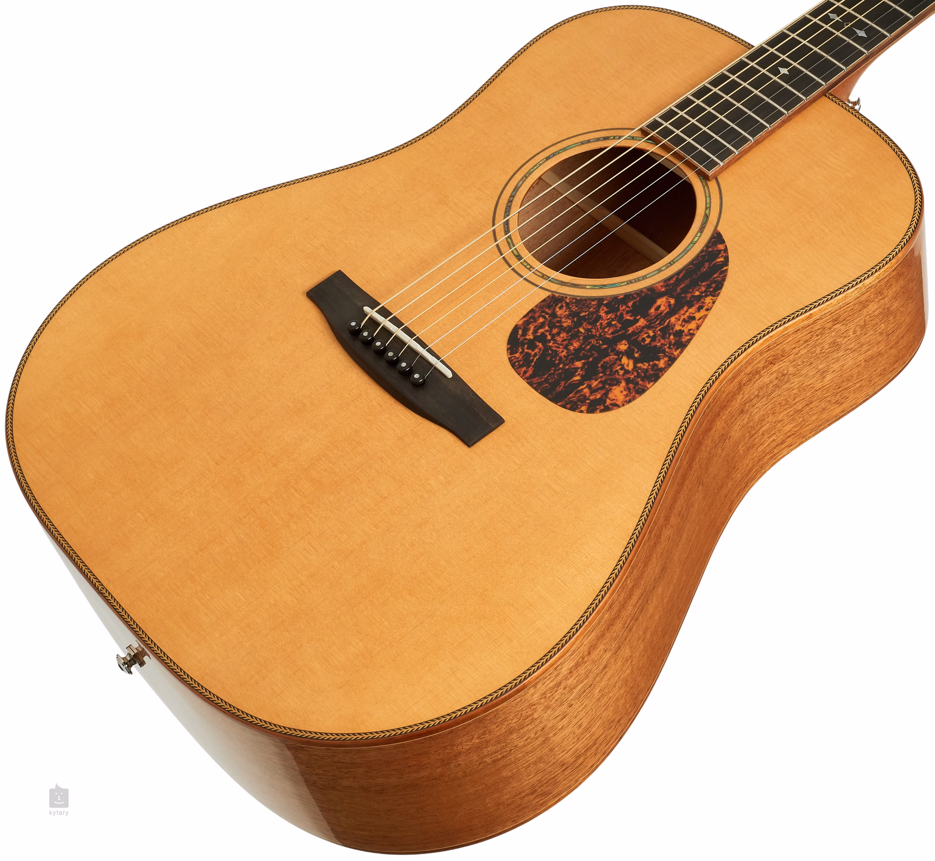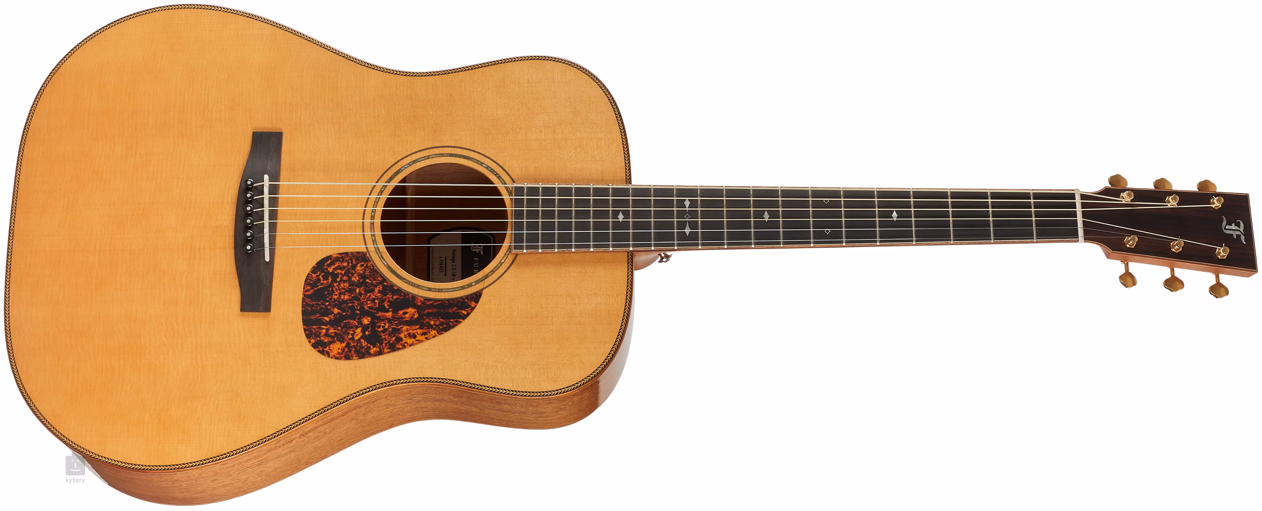 Orientację na hebanowym gryfie ułatwiają kwadratowe punktowe znaczniki pozycji z białej masy perłowej i boczne perłowe kropki. Stabilne strojenie gwarantują najwyższej klasy mechanizmy Gotoh SE700 w odcieniu złotej patyny o przełożeniu 1:15. Atrakcyjny wygląd gitary podkreśla obramowanie korpusu, główki i podstrunnicy z hawajskiego koa z kontrastową linią, wyściółka przedniej płyty z motywem rybiej kości, rozeta utworzona z podwójnego pierścienia z wyściółką z zielonego abalone, płytka na główce z palisandru madagaskarskiego i pickguard z imitacji szylkretu.