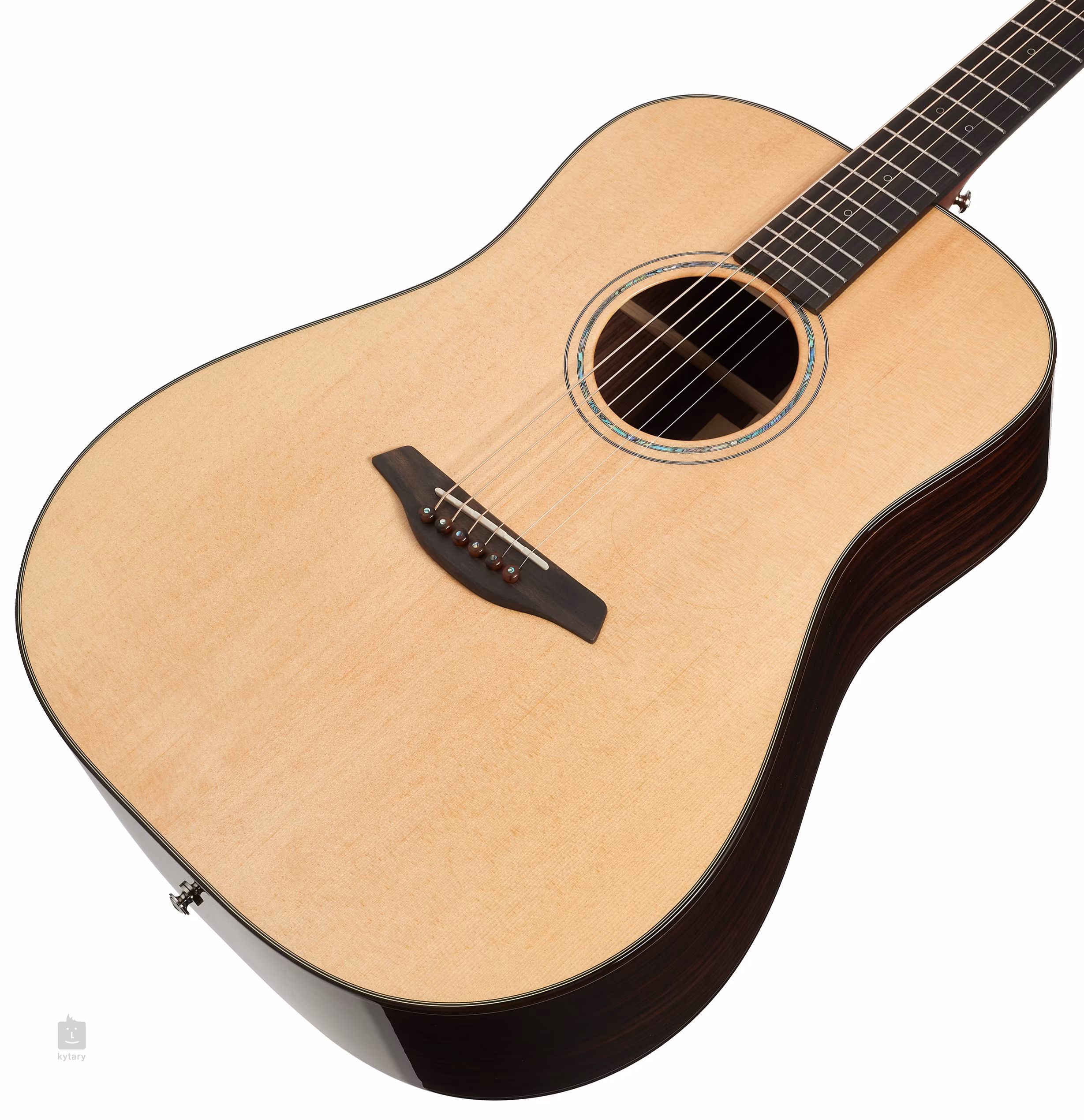 Orientację na hebanowym gryfie ułatwiają eleganckie przednie okrągłe znaczniki pozycji z cienką konturową linią z białej masy perłowej oraz boczne perłowe znaczniki punktowe. Przezroczysta płytka ochronna pozwala wydobyć naturalny rys drewna, nie wpływając jednocześnie na rezonans płyty przedniej. Stabilne strojenie gwarantują najwyższej klasy mechanizmy Gotoh 510 w srebrnej patynie z polerowanymi ebenowymi kołkami i bardzo delikatnym przełożeniem 1:21. Ładne wykończenie podkreślają delikatne detale w postaci obramowania korpusu z imitacji szylkretu i podwójnej rozety z inkrustacją z zielonego abalonu z czarno-białą linią.
