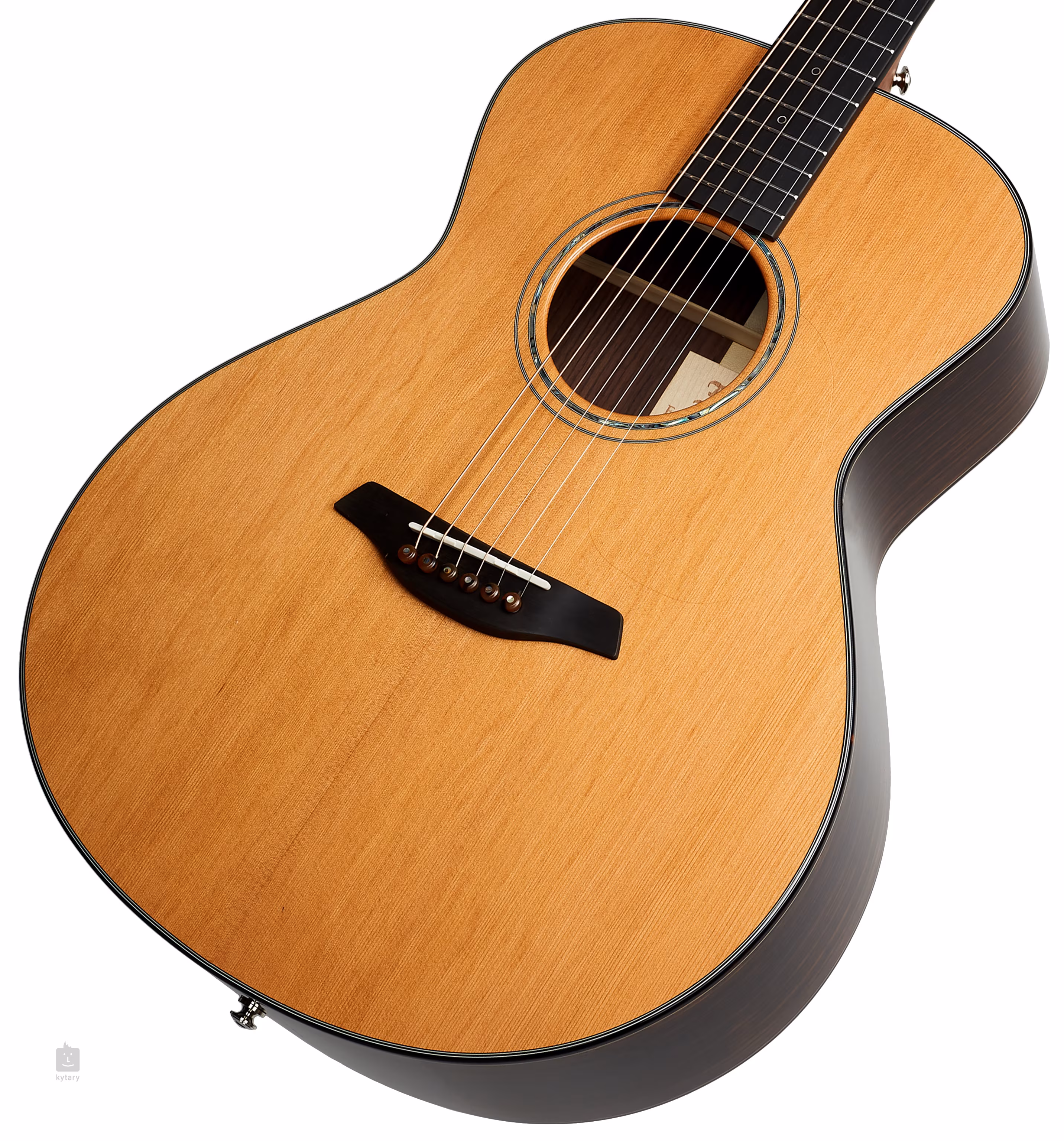 Orientację na hebanowym gryfie ułatwiają eleganckie przednie okrągłe znaczniki pozycji z cienką konturową linią z białej masy perłowej oraz boczne perłowe znaczniki punktowe. Przezroczysta płytka ochronna pozwala wydobyć naturalny rys drewna, nie wpływając jednocześnie na rezonans płyty przedniej. Stabilne strojenie gwarantują najwyższej klasy mechanizmy Gotoh 510 w srebrnej patynie z polerowanymi ebenowymi kołkami i bardzo delikatnym przełożeniem 1:21. Ładne wykończenie podkreślają delikatne detale w postaci obramowania korpusu z imitacji szylkretu i podwójnej rozety z inkrustacją z zielonego abalonu z czarno-białą linią.