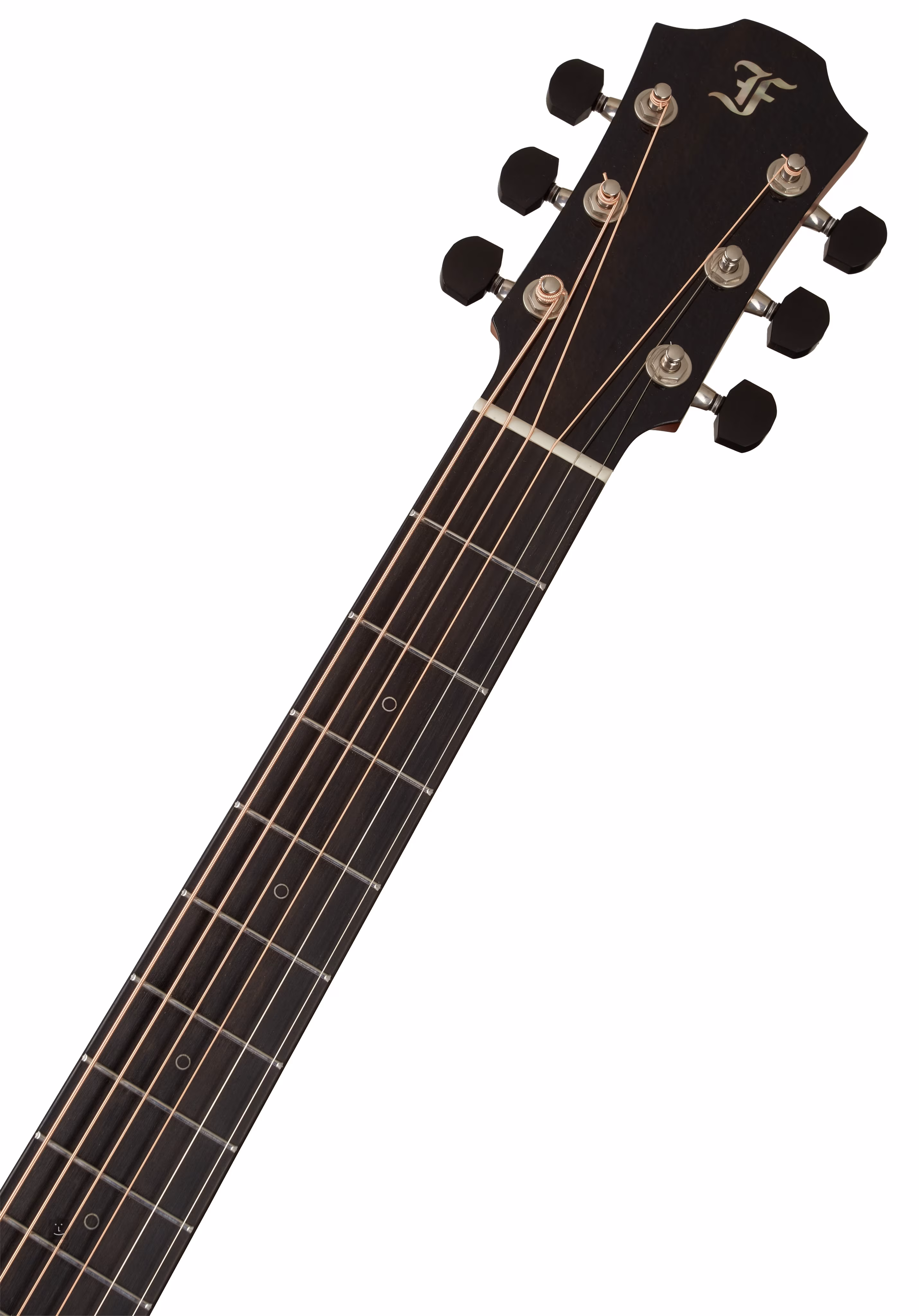 Orientację na hebanowym gryfie ułatwiają eleganckie przednie okrągłe znaczniki pozycji z cienką konturową linią z białej masy perłowej oraz boczne perłowe znaczniki punktowe. Przezroczysta płytka ochronna pozwala wydobyć naturalny rys drewna, nie wpływając jednocześnie na rezonans płyty przedniej. Stabilne strojenie gwarantują najwyższej klasy mechanizmy Gotoh 510 w srebrnej patynie z polerowanymi ebenowymi kołkami i bardzo delikatnym przełożeniem 1:21. Ładne wykończenie podkreślają delikatne detale w postaci obramowania korpusu z imitacji szylkretu i podwójnej rozety z inkrustacją z zielonego abalonu z czarno-białą linią.
