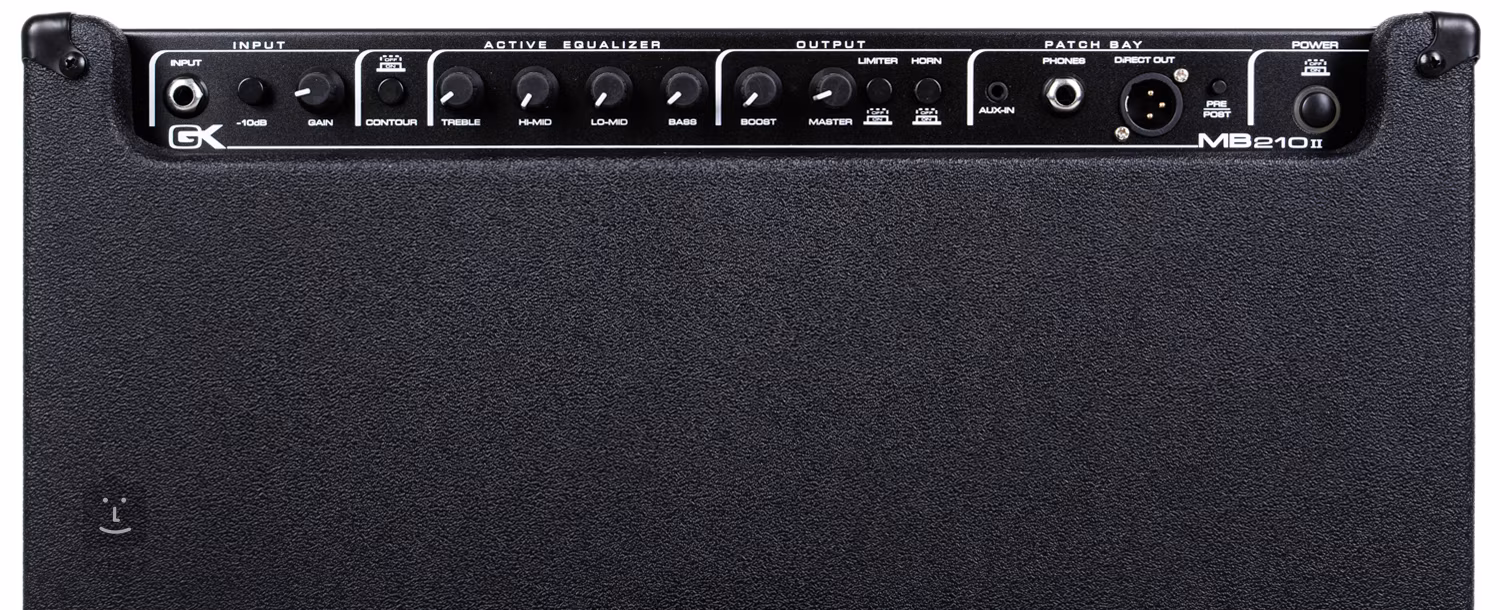 Elementy te, podobnie jak przetworniki, znajdują się na górnej ściance. Do regulacji brzmienia służy najpierw potencjometr Gain, a następnie 4-pasmowy EQ składający się z potencjometrów Treble, Hi-Mid, Lo-Mid i Bass. Ostatnimi potencjometrami są Boost, który działa jako wzmocnienie po korektorze oraz Master do regulacji ogólnej głośności. Funkcje Contour i Limiter są również przełączane na panelu przednim.
