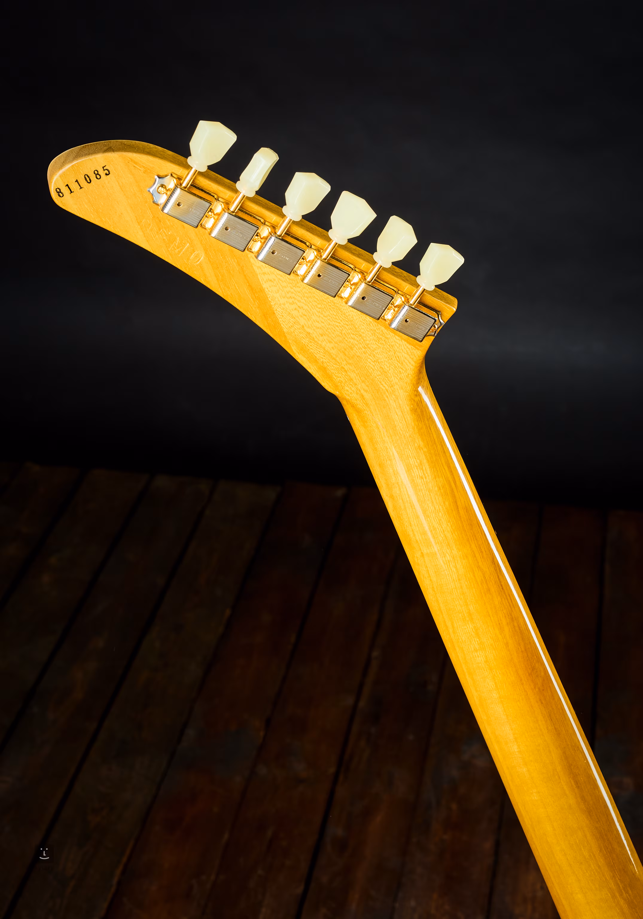 Jeden z 3 futurystycznych konceptów, które Gibson wprowadził w 1958 roku, to Explorer inspirowany błyskawicami, wykonany z drewna korina (korpus i szyjka) z palisandrową podstrunnicą. Ta współczesna replika z topowego Gibson Custom Shop jest wykonana autentycznie w stylu lat 50-tych: profil szyjki to 50s Vintage; przetworniki Gibson Custombucker z epoki; lakier nitro; czy luksusowy brązowy futerał z epoki z różowym wnętrzem.