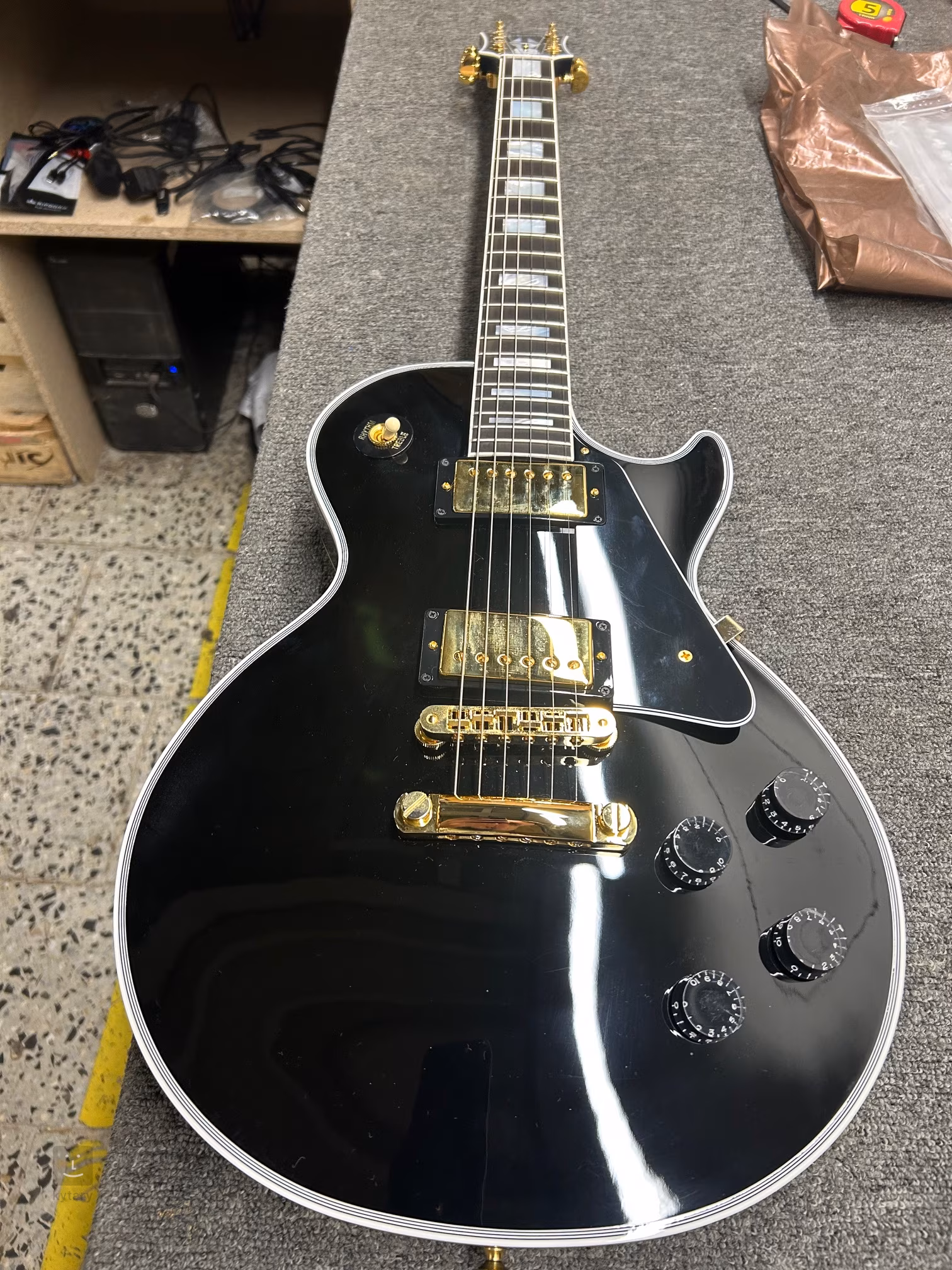 Niewiele jest gitar elektrycznych, o których można powiedzieć, że są tak klasyczne lub legendarne jak model Les Paul amerykańskiego producenta Gibson. Les Paul Custom w/ Ebony Fingerboard Gloss Ebony to najwyższej klasy model z Gibson Custom Shop. Lity mahoniowy korpus posiada dwuczęściowy klonowy top, ciemne hebanowe wykończenie i błyszczący lakier nitro. Do mahoniowej szyjki przyklejona jest hebanowa podstrunnica wyposażona w dwadzieścia dwa progi Medium Jumbo. Orientację na powierzchni podstrunnicy ułatwiają bloki pozycyjne wykonane z masy perłowej. Za brzmienie instrumentu odpowiadają dwa humbuckery 498T/490R znane z modeli Gibson z lat 60-tych. Ich charakter nawiązuje do vintage'owych przetworników PAF, tyle że z mniej agresywnymi wysokimi tonami i większą klarownością w średnicy. Do regulacji brzmienia służą dwa potencjometry głośności, dwa potencjometry barwy tonu oraz trójpozycyjny przełącznik przetworników. Stabilne strojenie jest gwarantowane przez mocowanie strun za pomocą zerowego progu Corian w maszynkach do strojenia Grover Kidney oraz przez mostek TOM w podstrunnicy. Luksusowe wykonanie podkreślają złote okucia, wielowarstwowy binding korpusu i pickguard dopasowany kolorystycznie do korpusu. Gitara dostarczana jest w futerale z certyfikatem autentyczności.