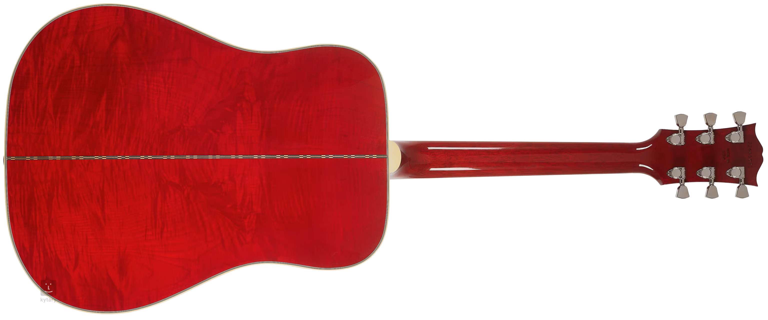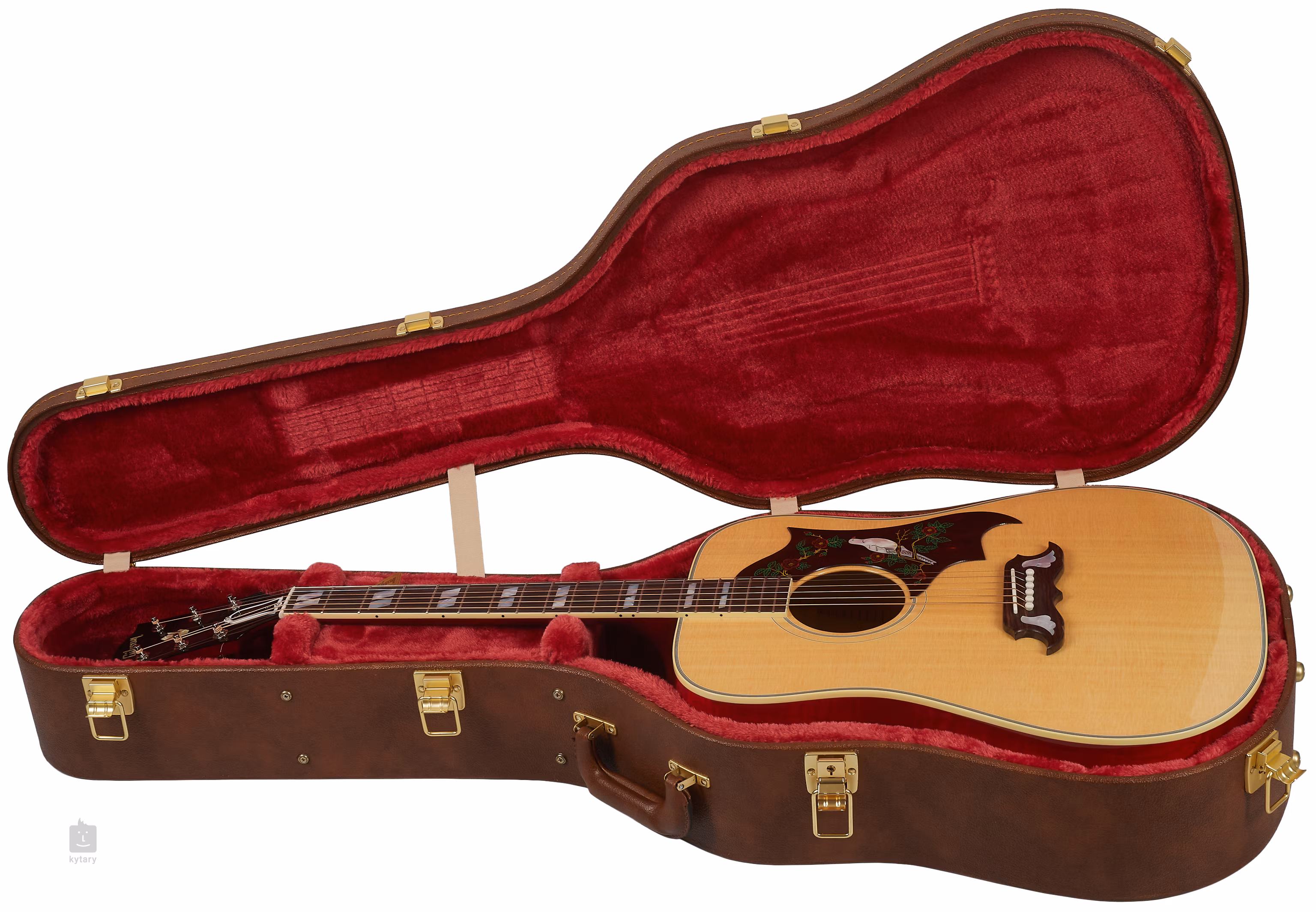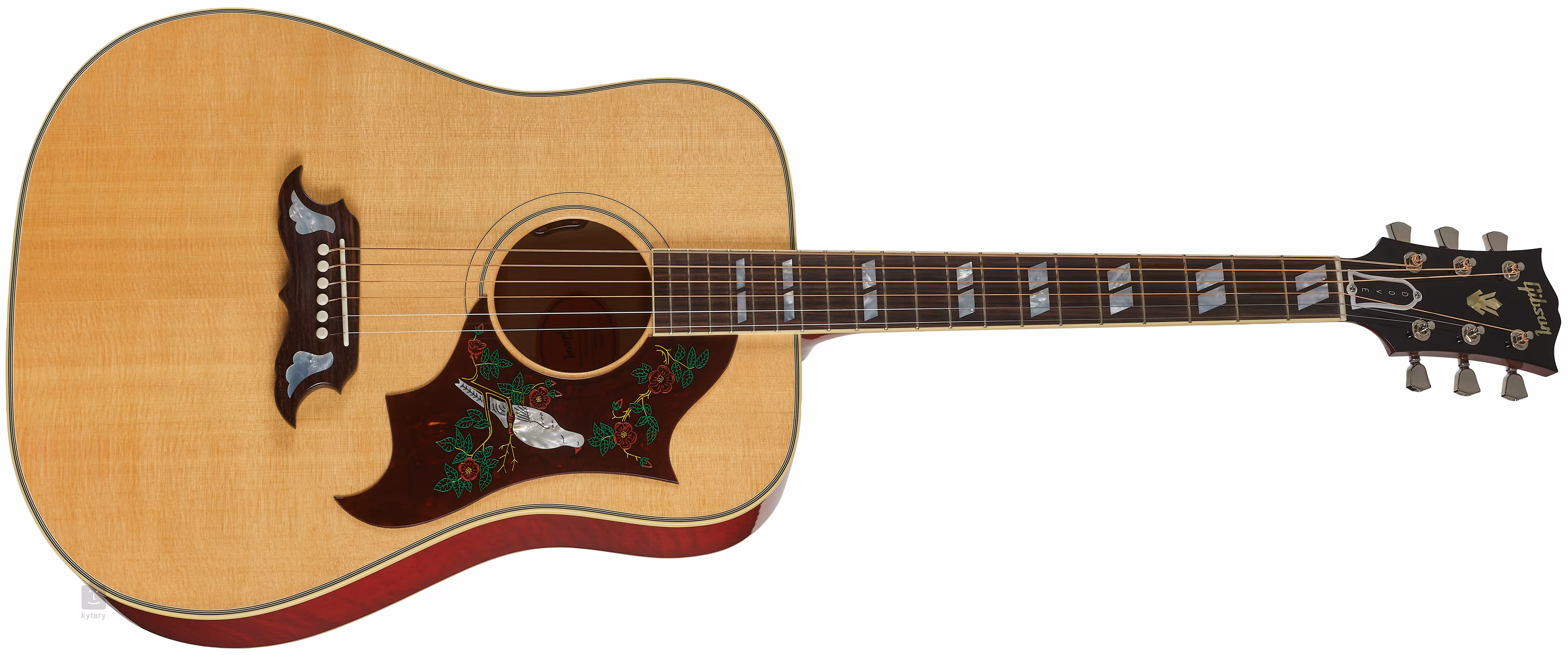 Struny są utrzymywane na miejscu przez maszynki do strojenia Grover Keystone i palisandrową podstrunnicę za pośrednictwem podstrunnicy i siodełka z kości. Stylowe wykończenie jest podkreślone przez wielowarstwowe dwustronne wiązanie obwodowe z subtelną nutą patyny i ozdobną osłonę przetwornika inkrustowaną motywem gołębia z masy perłowej z ręcznie grawerowanymi i malowanymi detalami.