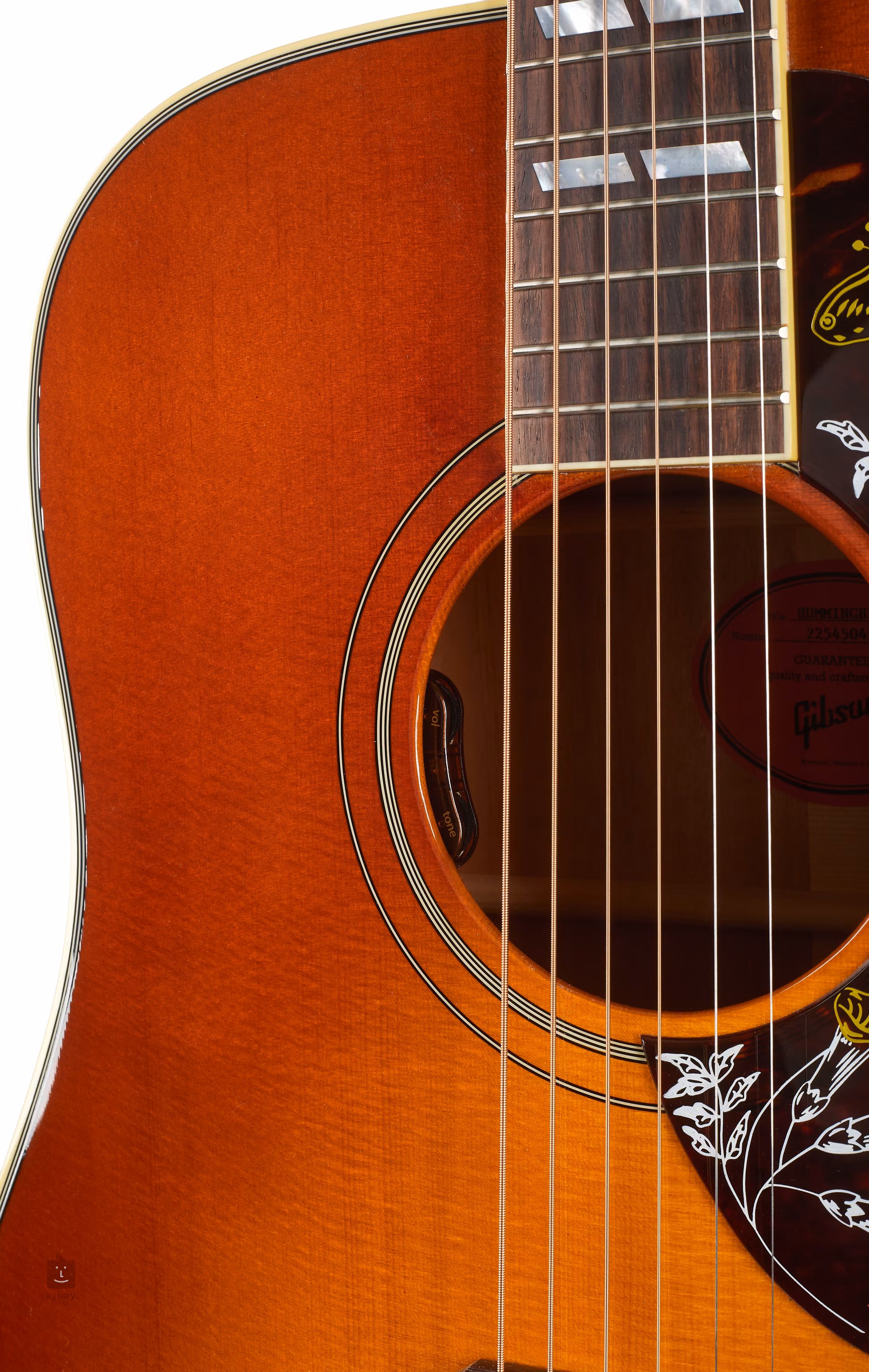 Struny są utrzymywane na miejscu przez maszynki do strojenia Gotoh Keystone i palisandrową podstrunnicę za pośrednictwem podstrunnicy i siodełka z kości. Stylowe wykończenie podkreśla wielowarstwowy, dwustronny binding obwodowy z subtelną nutą patyny oraz ozdobny pickguard "Hummingbird".