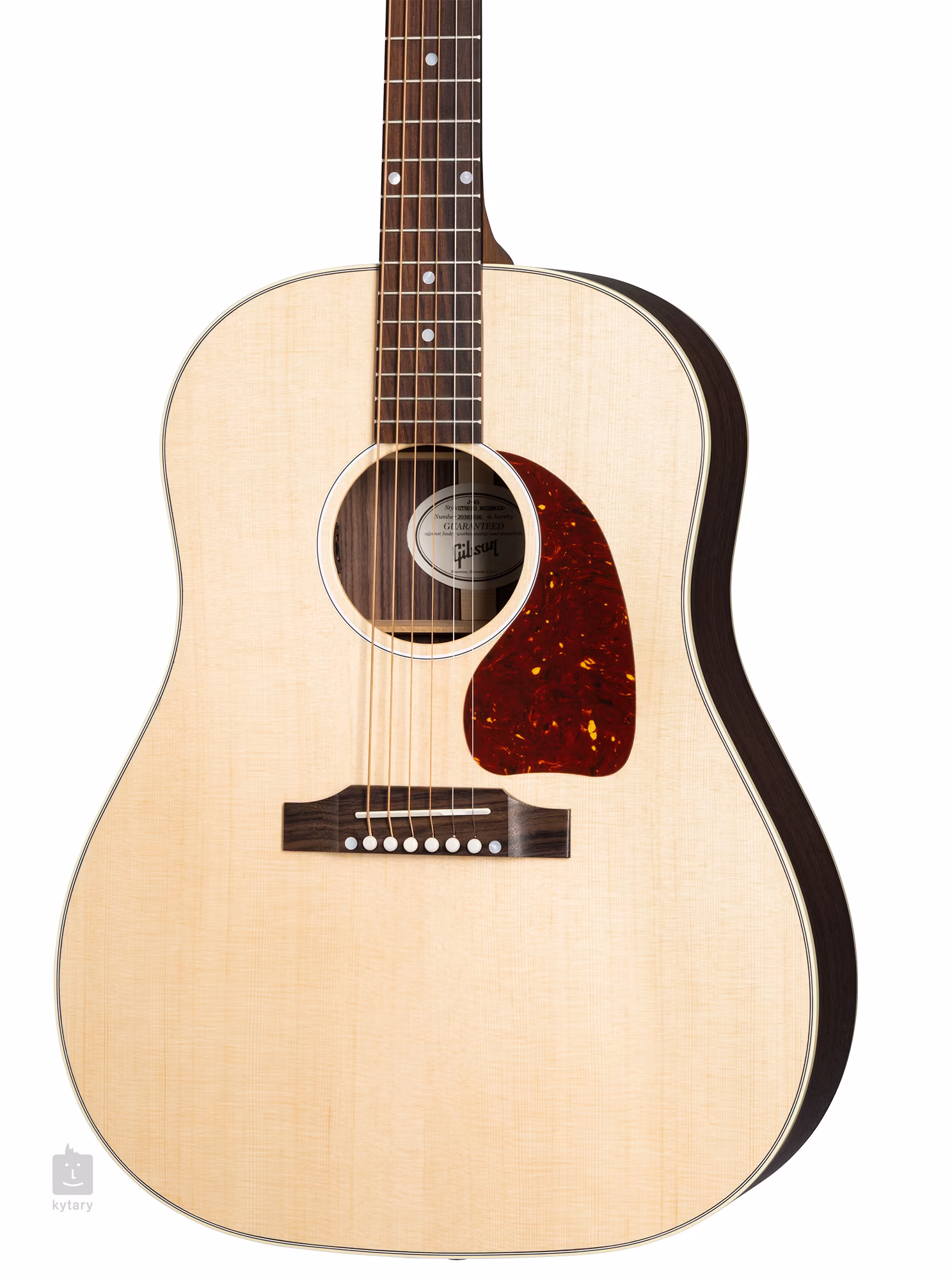 Przód J-45 Studio Rosewood Satin Natural wykonano ze świerku Sitka, natomiast tył i boki z palisandru. W przeciwieństwie do starszych "smukłych" modeli J-45 Studio, jest to instrument o standardowej głębokości. Rezonans wierzchu wspiera ręcznie wycinane ożebrowanie typu X, a korpus pokryty jest cienką warstwą satynowego lakieru wykonanego z nitrocelulozy. Szyjka sipo/utile z profilem Advanced Response jest przyklejona do palisandrowej podstrunnicy wyposażonej w dwadzieścia progów w standardowym rozmiarze. Orientację na podstrunnicy ułatwiają perłowe kropki pozycyjne.