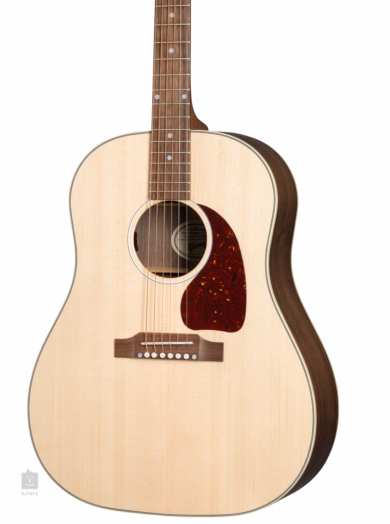 Przód J-45 Studio Walnut Satin Natural wykonano ze świerku Sitka, natomiast tył i boki z orzecha włoskiego. W przeciwieństwie do starszych "smukłych" modeli J-45 Studio, jest to instrument o standardowej głębokości. Rezonans topu wspiera ręcznie wycinane ożebrowanie typu X, a korpus pokryty jest cienką warstwą satynowego lakieru wykonanego z nitrocelulozy. Do szyjki sipo/utile o profilu Advanced Response przyklejona jest orzechowa podstrunnica wyposażona w dwadzieścia progów w standardowym rozmiarze. Orientację na podstrunnicy ułatwiają perłowe kropki pozycyjne.