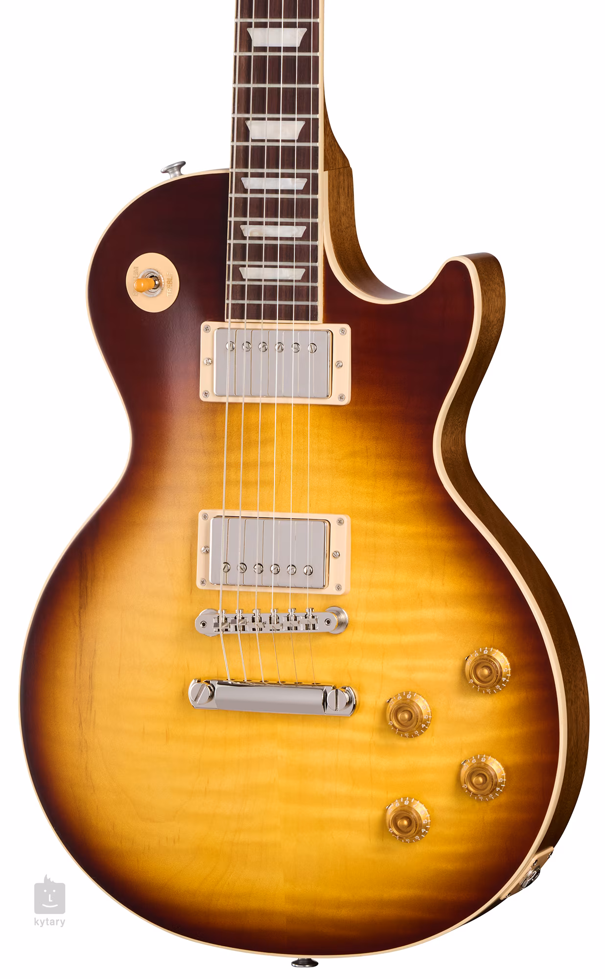 Mahoniowy korpus gitary Les Paul Standard 50s Faded Vintage Tobacco Burst jest ozdobiony spektakularnym topem z klonu figured o jakości AA i wykończeniem Vintage Tobacco Burst. Satynowe wykończenie lakierem nitrocelulozowym nadaje gitarze wygląd instrumentu, który był posiadany i pielęgnowany przez dłuższy czas. Do mahoniowej szyjki o zaokrąglonym profilu Vintage z lat 50-tych przyklejona jest podstrunnica z palisandru indyjskiego wyposażona w dwadzieścia dwa progi Medium Jumbo. Orientację podstrunnicy ułatwiają bloki pozycjonujące wykonane z imitacji masy perłowej (Acrylic Trapezoid).