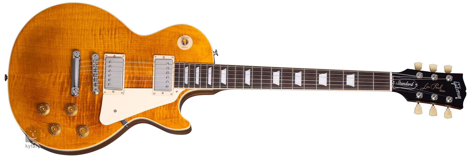 Mahoniowy korpus gitary Les Paul Standard 50s Figured Top Honey Amber ozdobiony jest spektakularnym topem z klonu figured o jakości AA i wykończeniem Honey Amber. Cienkie wykończenie w postaci lakieru nitrocelulozowego pozwala drewnu gitary oddychać i poprawia walory brzmieniowe instrumentu. Mahoniowa szyjka o zaokrąglonym profilu Vintage 50s jest przyklejona do podstrunnicy z palisandru indyjskiego wyposażonej w dwadzieścia dwa progi Medium Jumbo. Bloki pozycyjne wykonane z imitacji masy perłowej (Acrylic Trapezoid) ułatwiają orientację na jej powierzchni.