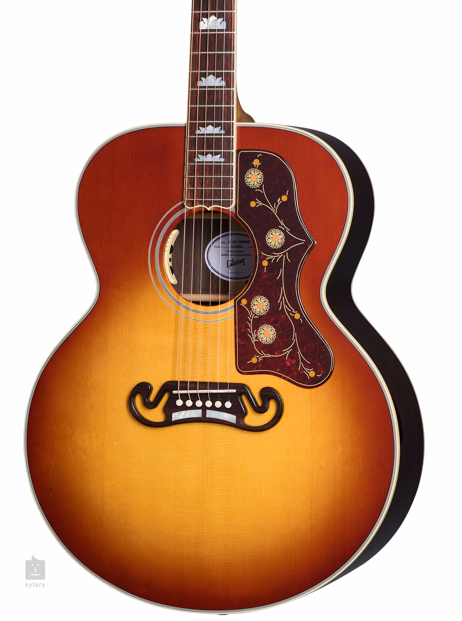 Przód gitary SJ-200 Standard Rosewood Burst wykonano ze świerku Sitka, natomiast tył i boki z palisandru. Rezonans wierzchu jest wspierany przez ręcznie wycinane ożebrowanie typu X, a korpus jest pokryty błyszczącym lakierem nitrocelulozowym. Mahoniowa szyjka o zaokrąglonym profilu "Round" jest przyklejona do podstrunnicy z palisandru indyjskiego wyposażonej w dwadzieścia progów w standardowym rozmiarze. Znaczniki pozycji Graduated Crown z masy perłowej na podstrunnicy ułatwiają orientację.