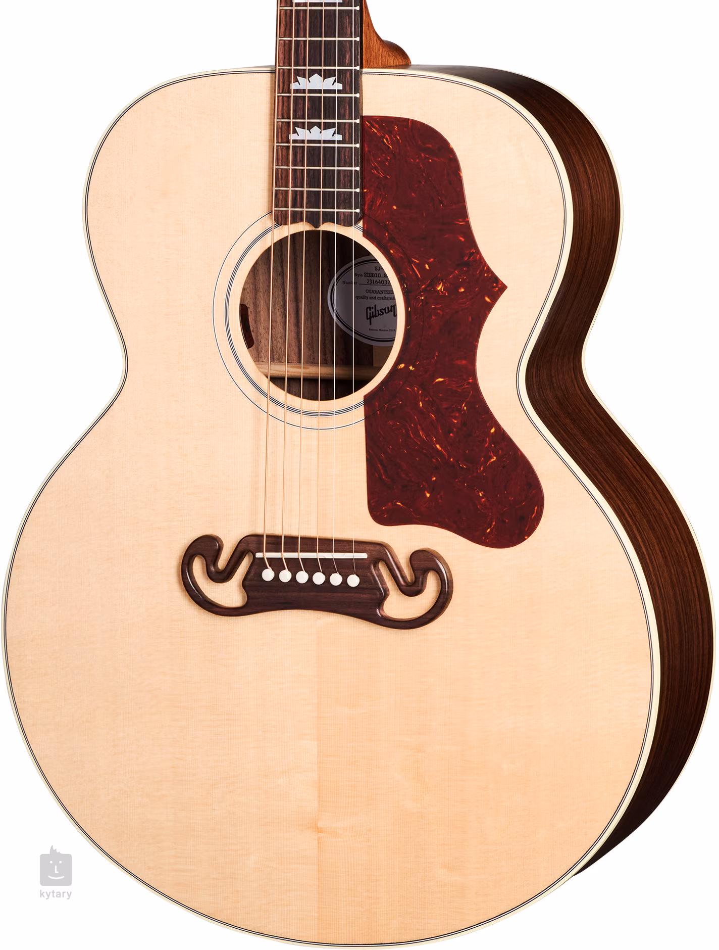 Płyta przednia gitary elektroakustycznej SJ-200 Studio Rosewood Natural wykonana jest z litego drewna świerku sitkowego, natomiast płyta tylna i boki z litego palisandru. Połączenie tych materiałów oraz standardowa głębokość dużego korpusu Super Jumbo zapewniają gitarze brzmienie o doskonałej głośności i projekcji oraz pięknie pełne, bogate basy charakterystyczne dla korpusu z palisandru. Rezonans płyty przedniej wspierają ręcznie wycięte żebra typu X, a korpus pokrywa cienka warstwa lakieru nitrocelulozowego (płyta przednia błyszcząca, płyta tylna i boki matowe).